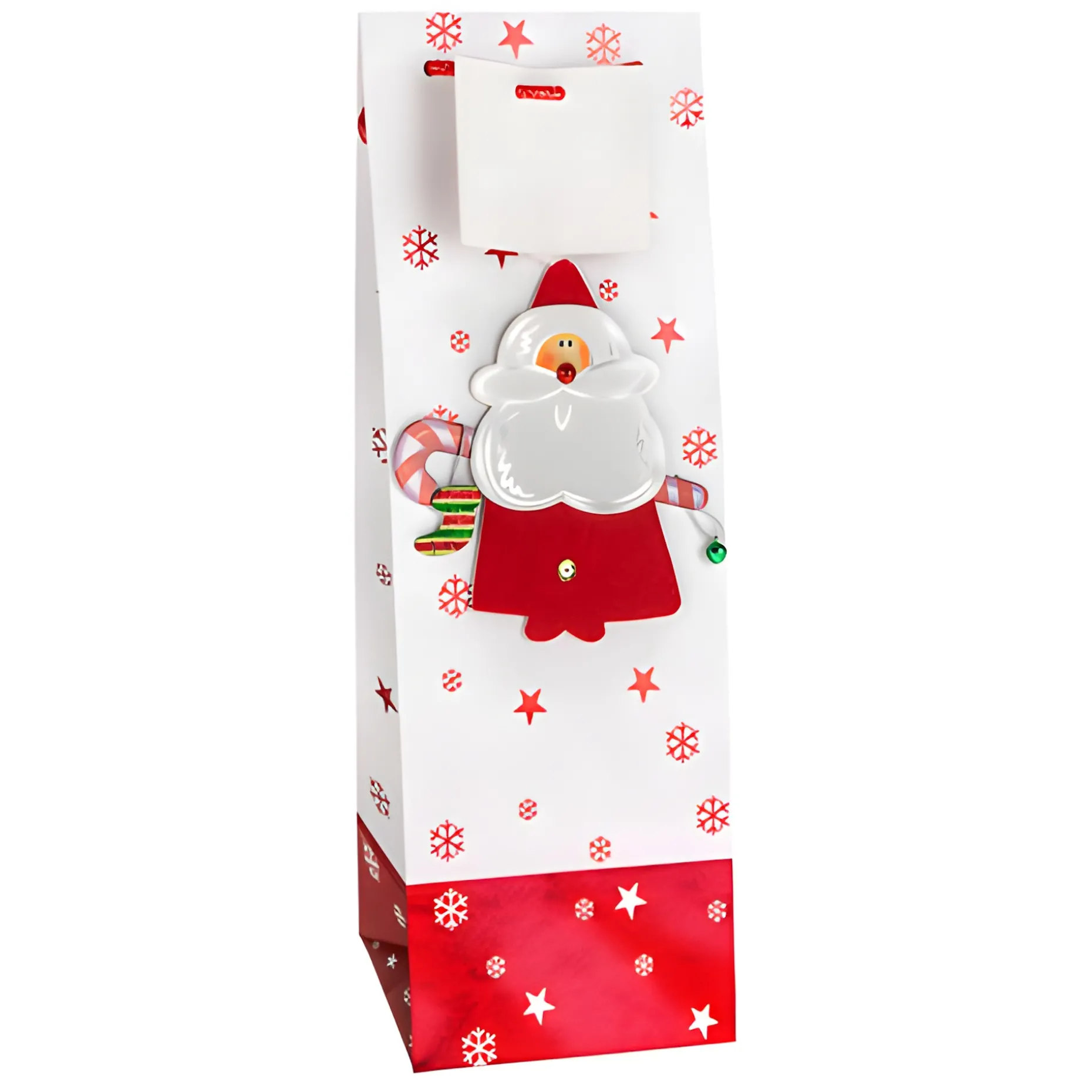 Schön verzierte Flaschentasche mit einem 3D Weihnachtsmann, der auf der Vorderseite ein kleines Glöckchen mit sich trägt. Die stabile Papier-Tragetasche ist in den Farben rot und weiß gehalten, mit Schneeflocken und Sternen verziert und hat eine rote Tragekordel an der eine Karte zum Beschriften befestigt ist. Sie eignet sich perfekt für Geschenke und breitere Flaschen in der Weihnachtszeit, auch eine Whiskey-Karaffe findet in dieser Verpackung ausreichend Platz.