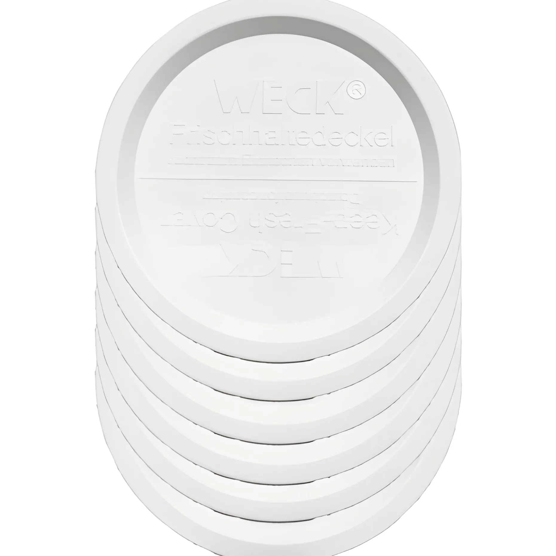 WECK-Frischhaltedeckel sind sehr praktisch, um vorbereitete Speisen im Glas, wie z. B. eingekochtes Obst, eingelegtes Gemüse, Suppen und Eintöpfe bis zum Verzehr im Kühlschrank aufzubewahren und zu schützen. Die Deckel bestehen aus lebensmittelechtem Kunststoff und sind tiefkühlgeeignet, aber nicht kochfest.