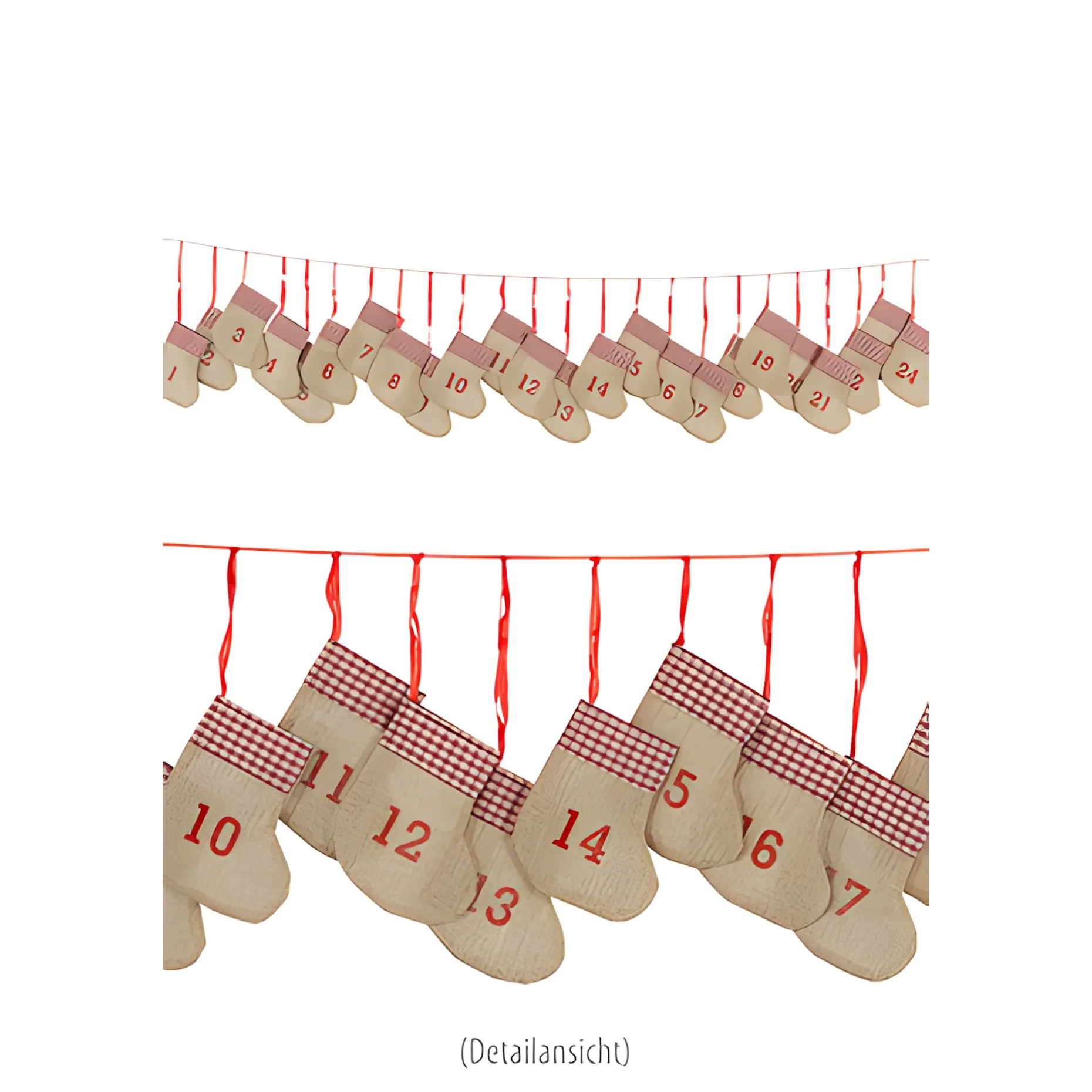 Socken-Adventskalender zum Aufhängen und Selberfüllen. Der traditionelle Kalender zur Weihnachtszeit besteht aus kleinen Jute-Söckchen, die am Bund einen rot karierten Stoff haben und mit einem roten Band miteinander verbunden sind. So können die Socken mit den aufgemalten Zahlen 1 bis 24 ganz einfach wie eine Wäscheleine aufgehangen und mit kleinen Geschenken und Süßigkeiten befüllt werden. Kleine Fläschen mit selbstgemachtem Shot, Smoothie oder auch Likör passen ebenfalls in die wiederverwendbaren Weihnachtssocken, die an der Wand oder im Türrahmen einfach klasse aussehen.