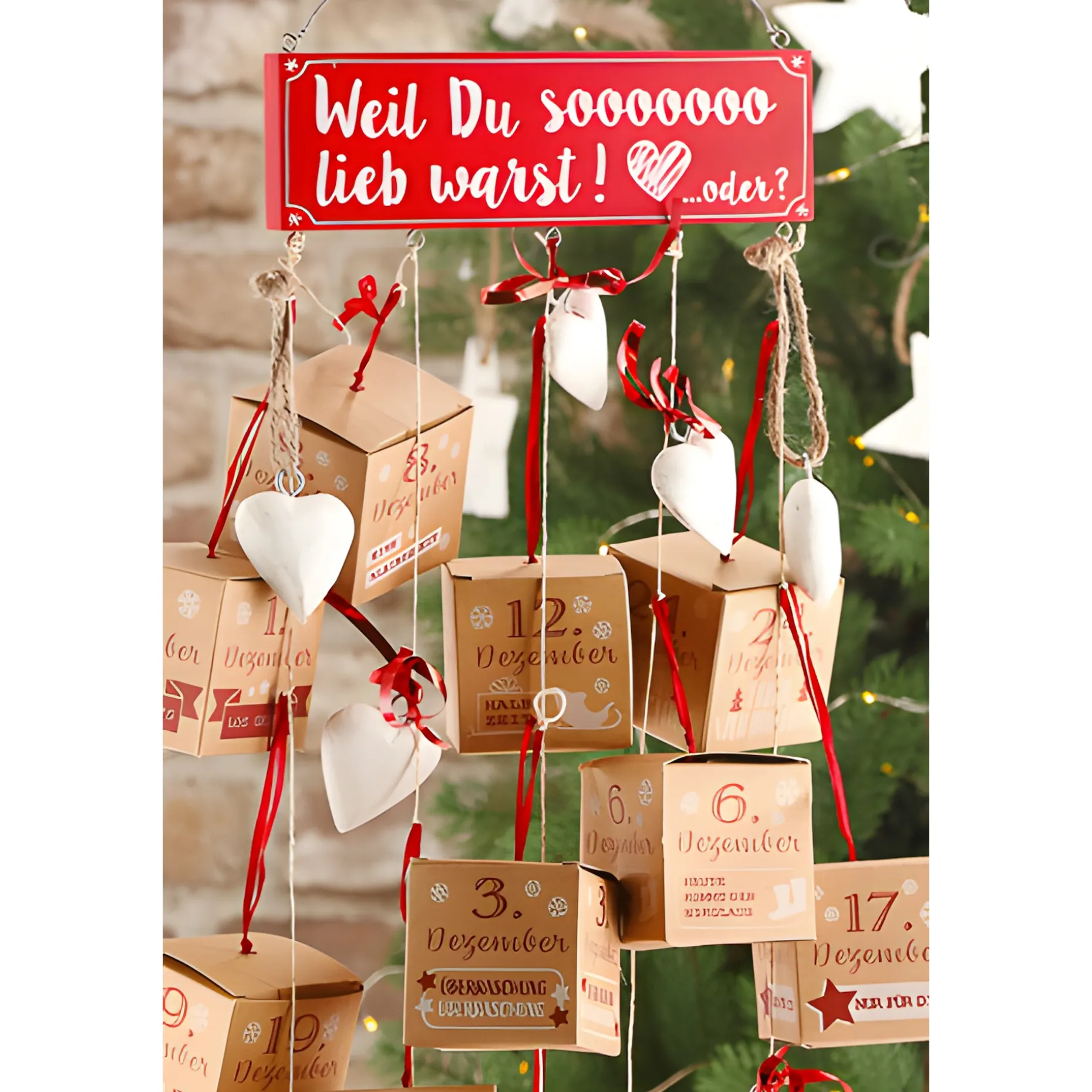 Mit diesen dekorativen Boxen aus festlich bedrucktem Kraftpapier können Sie im Handumdrehen einen tollen Adventskalender für Ihre Lieben basteln. Die quadratischen Kartons sind mit Adventskalender-Zahlen, Schneeflocken, verschiedenen Sprüchen und Motiven versehen und lassen sich leicht zusammenfalten. 6 Zahlenschachteln sind schon fertig gefaltet und mit einer roten Schlaufe versehen, bei den restlichen ist Ihre Fingerfertigkeit gefragt. Die einzelnen Boxen können mit kleinen Geschenken oder Aufmerksamkeiten befüllt werden und erfreuen den Beschenkten in der Vorweihnachtszeit jeden Tag aufs Neue.