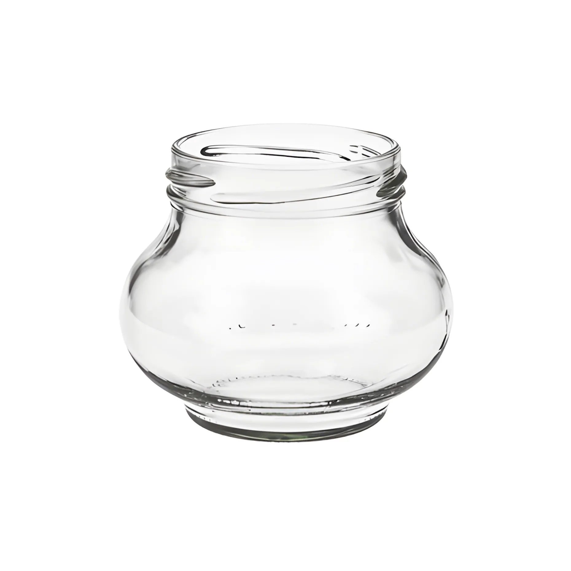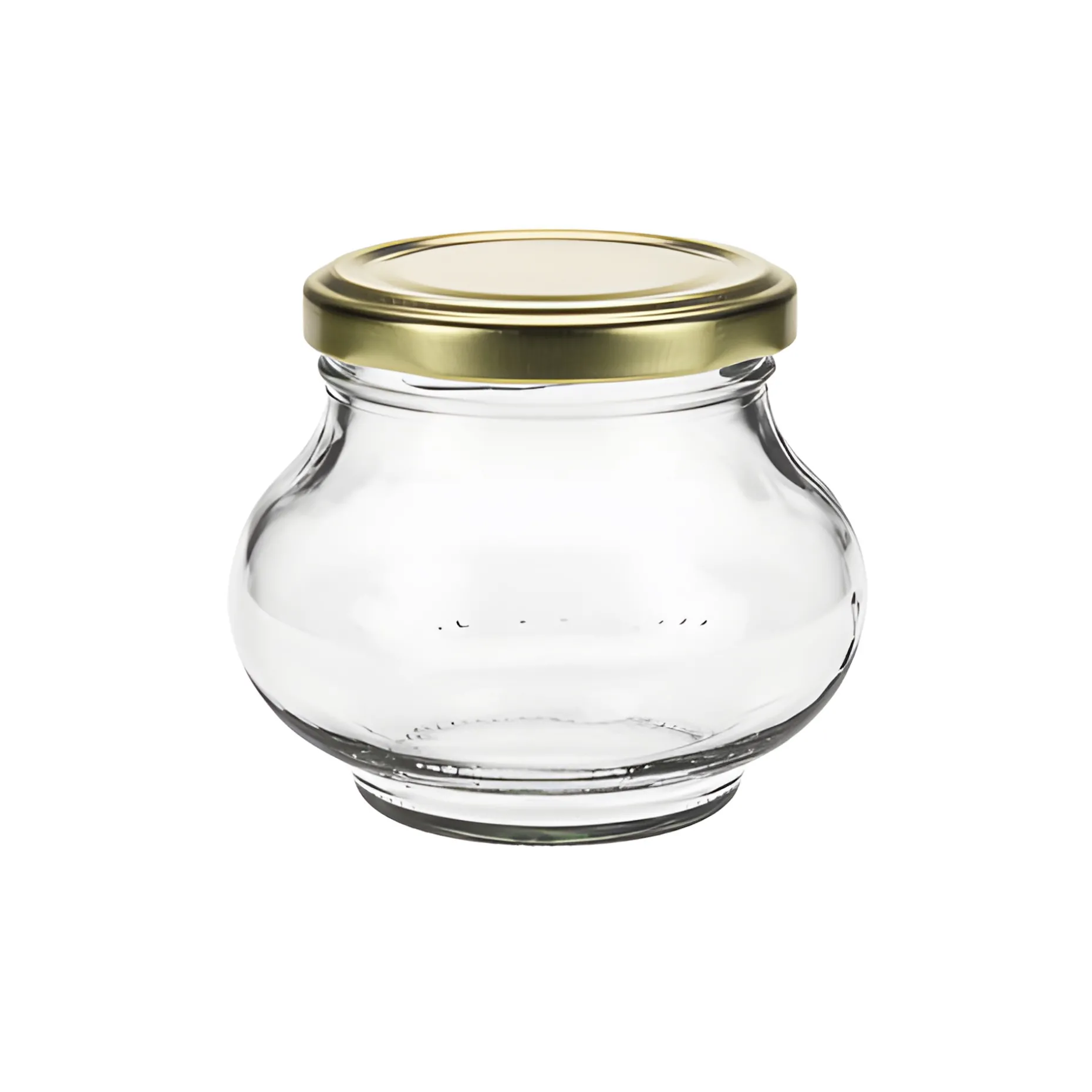 Dieses Glas in Schmuckform wird gern für Gelee und Konfitüre genutzt. Die bauchige Form führt zu einem großen Fassungsvermögen, so finden 235 ml in dem hübschen Einmachglas Platz. Die passenden Verschlüsse der Größe TO 63 finden Sie bei uns in vielen verschiedenen Farben. Das Bauchglas lässt sich auch sehr gut mit unseren Marmeladendeckchen verzieren und ist selbstverständlich zum Einkochen geeignet.