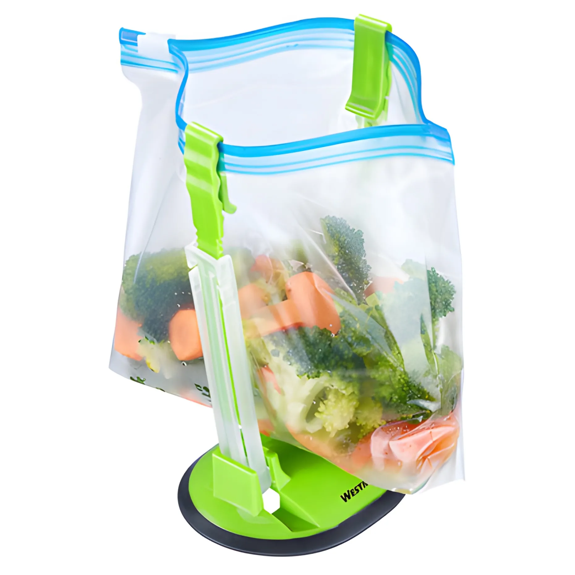 Der Beutelhalter von WESTMARK wurde speziell entwickelt, um Ihnen das Halten und Befüllen von Gefrier-, Spritzbeuteln oder kleineren Tüten zu erleichtern. Er ist mit höhenverstellbaren Halte-Zangen ausgestattet, so dass er an die Größe Ihrer Lebensmittelbeutel angepasst werden kann. Zudem lässt sich der Gefrierbeutelhalter aus Kunststoff flach zusammenklappen und ermöglicht somit eine platzsparende Aufbewahrung.