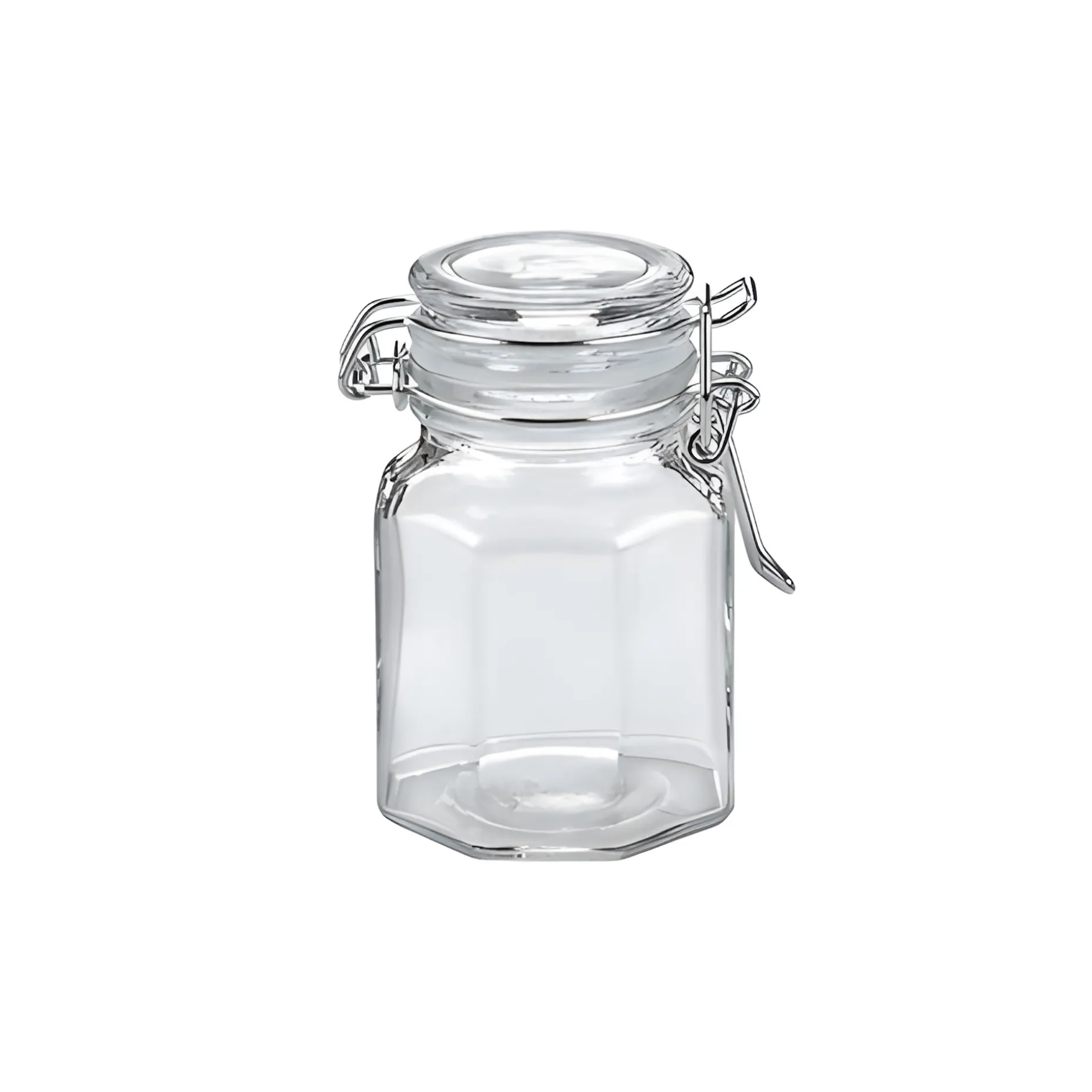 Kleines Achtkant-Bügelglas mit Dichtungsring. Das Mini-Vorratsglas ist super geeignet für Bonbons, Kräuter und andere trockene Zutaten, die dank des Gummirings luftdicht verschlossen werden. Vor allem im Gewürzregal kommt das kleine Achtkantglas super zur Geltung und wird zugleich platzsparend verstaut.