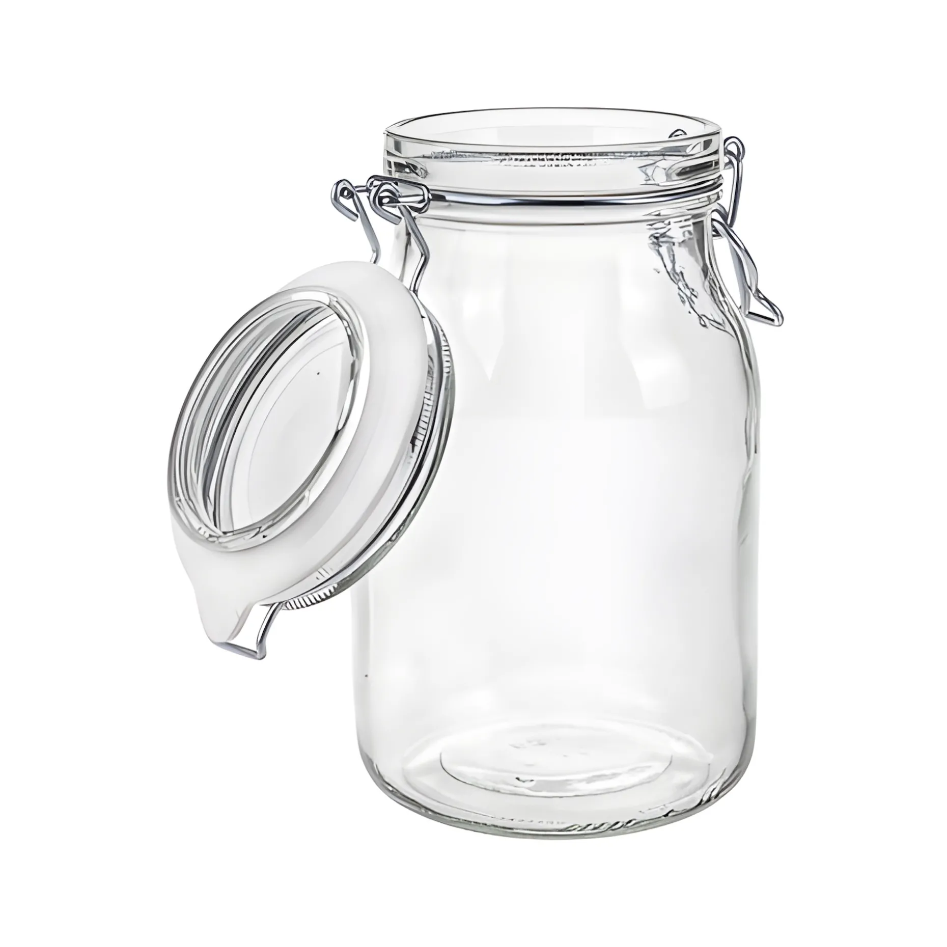 Schönes Drahtbügelglas mit weißem Gummiring zum Einlegen, Einkochen und Aufbewahren trockener Zutaten. Das Bügelglas ist mit seinen 1100 ml ideal für selbstgemachte Soßen, leckeres Kompott und eingelegtes Gemüse, das sicher verschlossen wird und damit lange haltbar ist. Das Einmachglas mit der breiten Öffnung lässt sich gut befüllen und kann super für trockene Koch- und Backzutaten, wie Zucker, Nüsse oder Mehl verwendet werden.