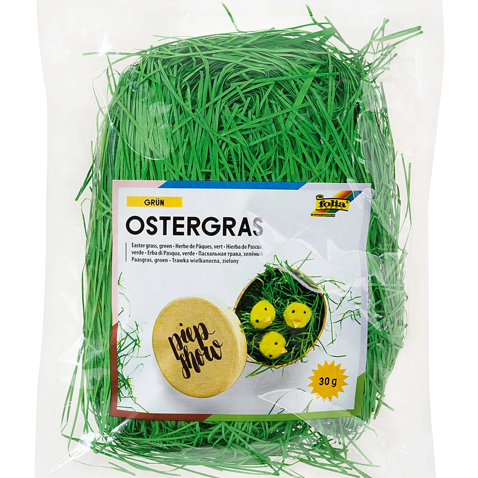 Ostergras gehört zu einem richtigen Osternest einfach dazu. Ein Körbchen mit grünem Papiergras und bunten Ostereiern ist ein hübscher Farbklecks und verbreitet fröhliche Osterstimmung. Das farbige Dekogras bereitet Schoko-Osterhasen und kleinen Plüsch-Küken ein kuscheliges Nest und ist das perfekte Füllmaterial für selbstgemachte Frühlings- oder Osterdekorationen, Blumensträuße und Gestecke.