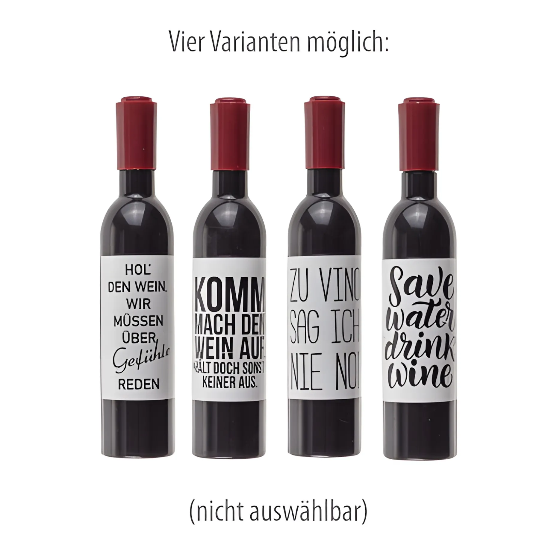 Der originelle Stil des Flaschenöffners wird durch einen aufgedruckten Spruch unterstrichen. Diesen gibt es in den Varianten: ‚Save Water Drink Wine‘, ‚Zu Vino sag ich nie no!‘, ‚Komm mach den Wein auf. Hält doch sonst keiner aus.‘ und ‚Hol鈥üssen über Gefühle reden‘.