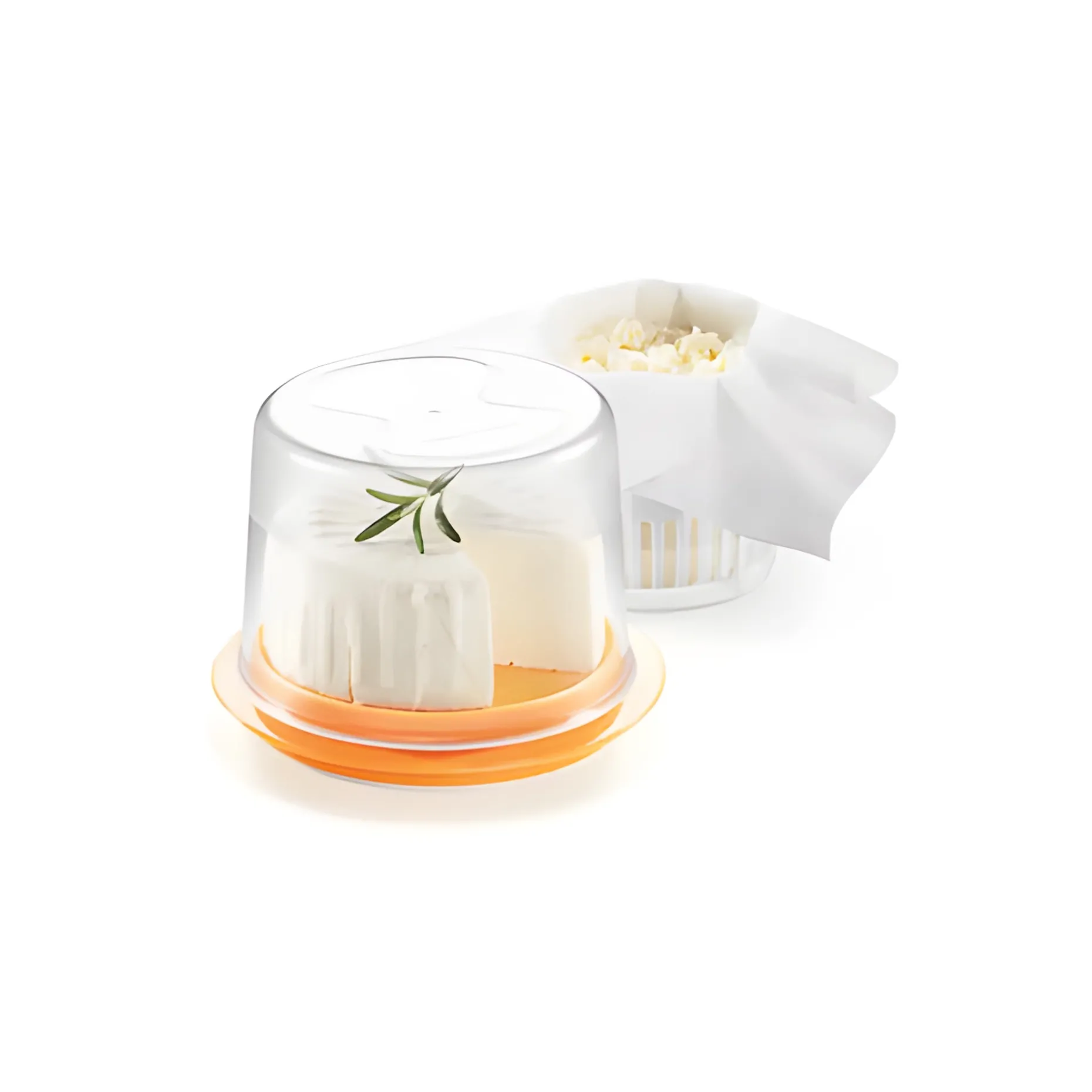 Das Set besteht aus einem rutschfesten Unterteller mit Auffangbehälter, die nach Fertigstellung für den Käse als Unterlage mit Haube zum Servieren und Aufbewahren dienen. Fünf wiederverwendbare Passiertücher, eine Siebdose mit Pressscheibe, Feder aus rostfreiem Edelstahl und Schraubdeckel komplettieren das Set aus robustem Kunststoff, dass bitte per Hand gespült werden sollte.