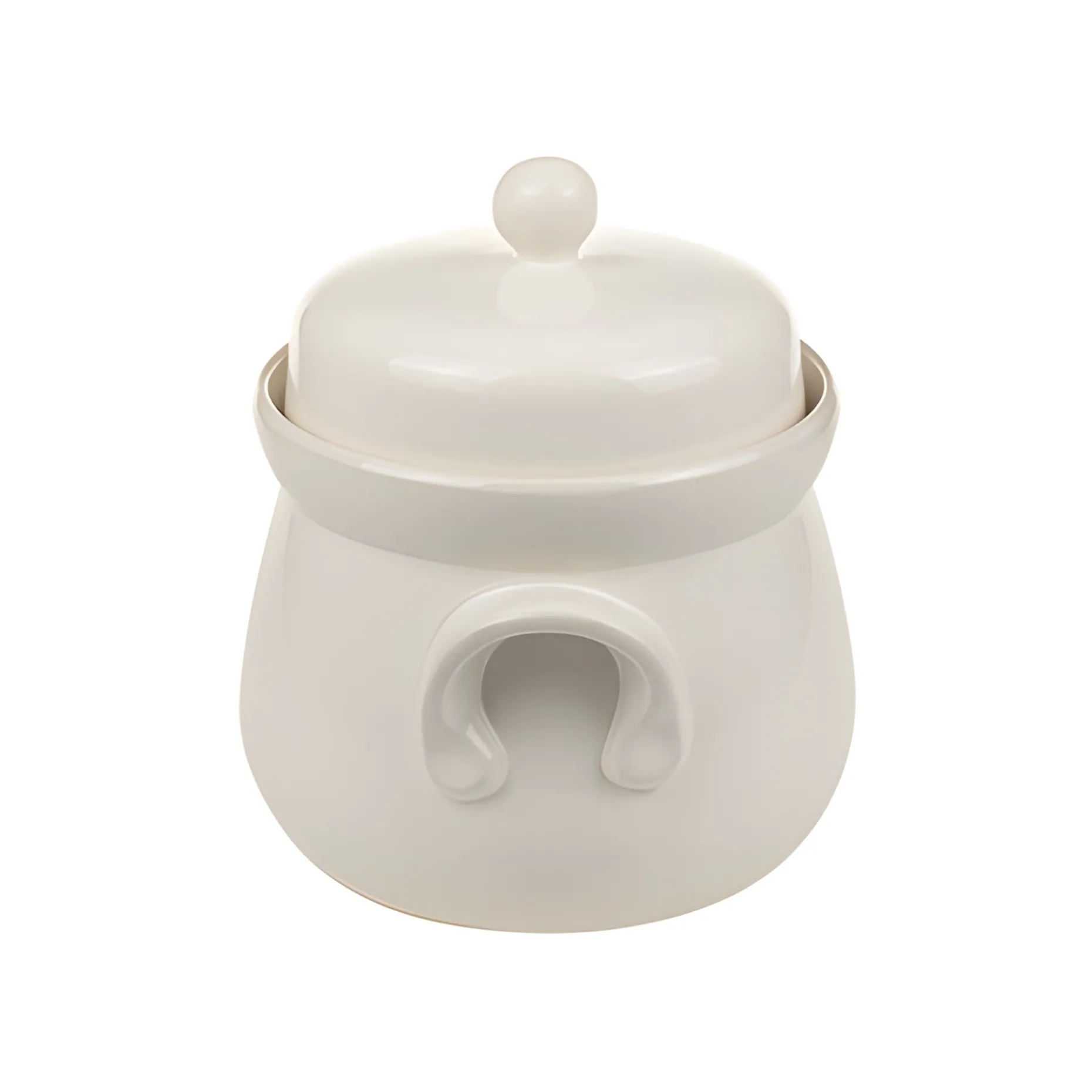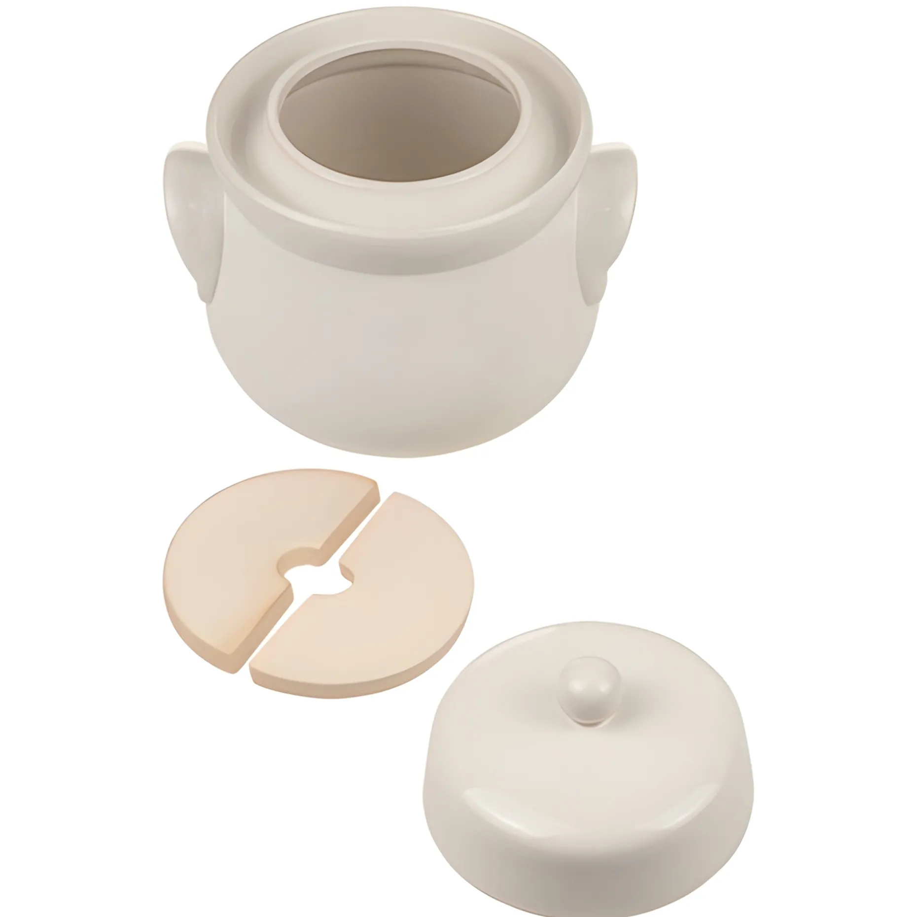 Mini-Gärtopf mit Deckel und Beschwerungssteinen zum Fermentieren. Der Sauerkrauttopf hat ein Fassungsvermögen von 4 Litern und ist aus cremefarbener Keramik. An der Öffnungsmündung des Topfes ist eine zusätzliche Vertiefung (Nut) angebracht, in die der Deckel eingesetzt wird. Mit dem passenden Deckel und den Fermentiersteinen haben Sie so alles zur Hand, um Sauerkraut, Kimchi und Salzgurken selbst herzustellen.