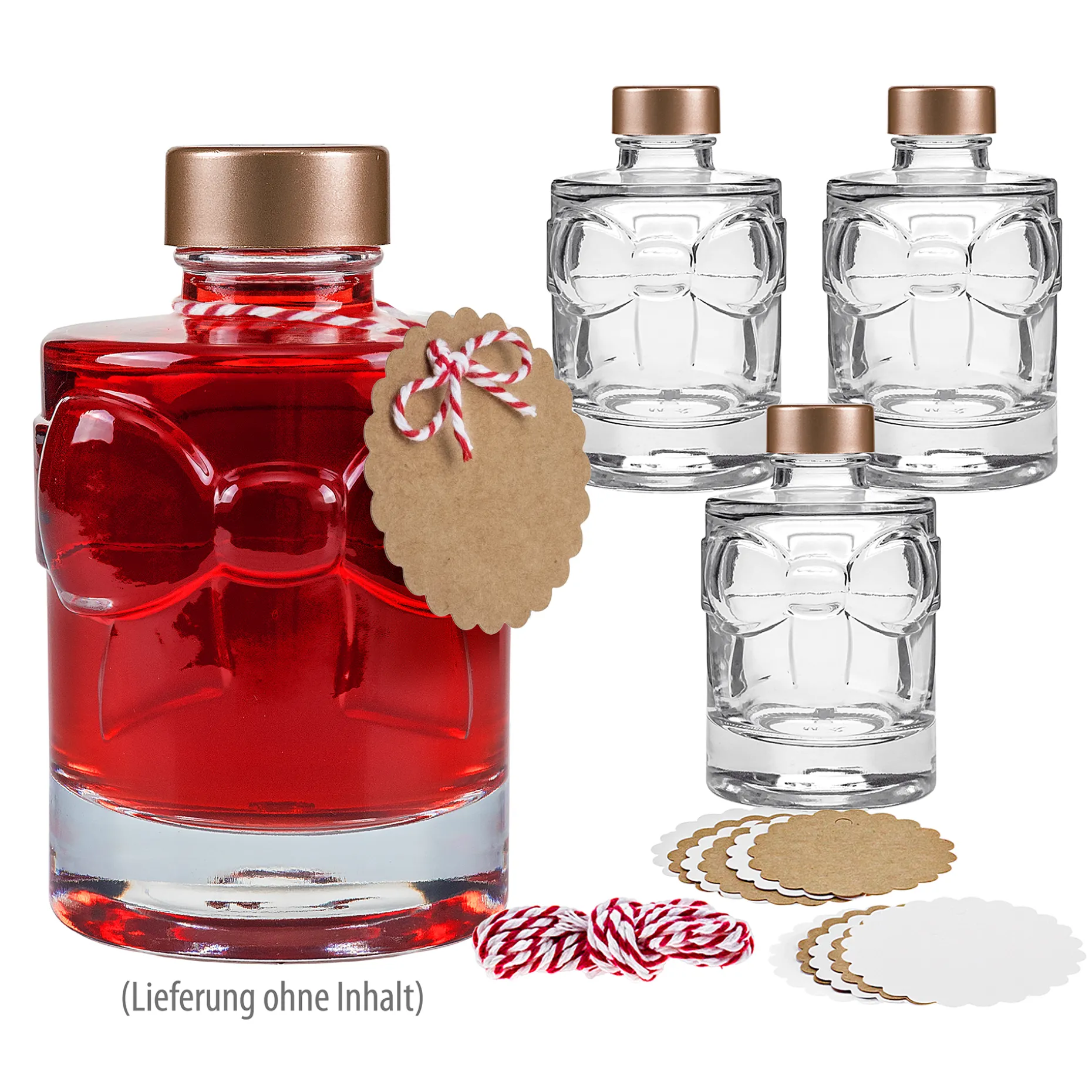 Mit diesem Set können Sie im Nu tolle Weihnachtsgeschenke zaubern. Es enthält 4 hochwertige Geschenkflaschen mit schönen Verschlüssen und hübsche Anhänge-Etiketten mit einer Schnur zum Festbinden.