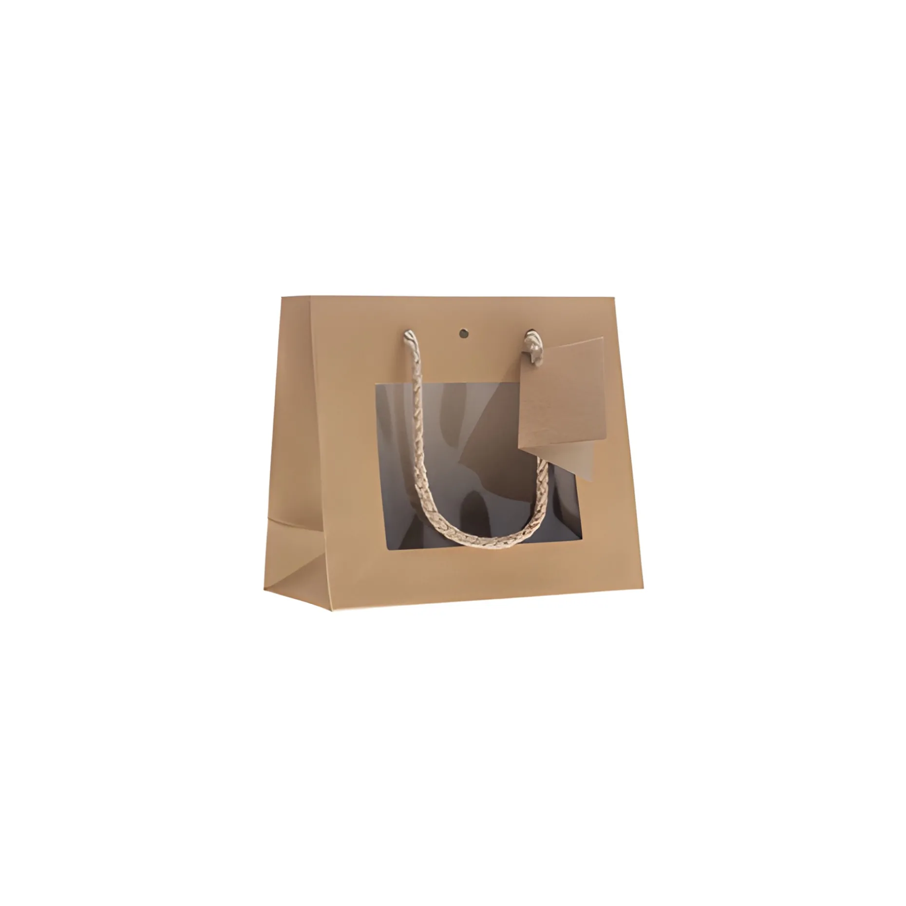 Diese kleine Tragetasche aus Kraftpapier hat auf der Vorderseite ein Sichtfenster, so kann man schon vorher einen Blick auf das Geschenk werfen. Die Papiertüte verfügt über zwei weiche Tragekordeln von denen bei einer auch ein Kärtchen zum Beschriften anhängt.