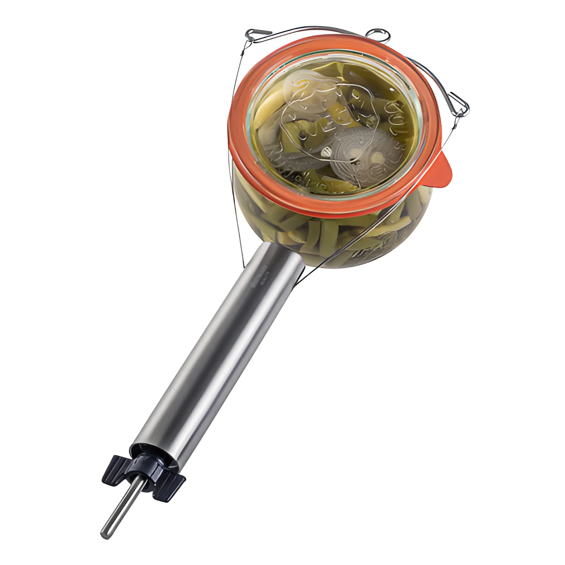 Und so einfach geht鈥檚: Man legt die entsprechende Schlinge zwischen Gummiring und Deckel, hält den Stab mit der einen Hand fest und zieht mit der anderen die Flügelmutter langsam an. Wenn der Draht straff unter dem Glasdeckel liegt und dieser sich leicht anhebt, kommt Luft ins Glas. So wird das Vakuum aufgehoben und der Glasdeckel lässt sich ohne Mühe abnehmen.