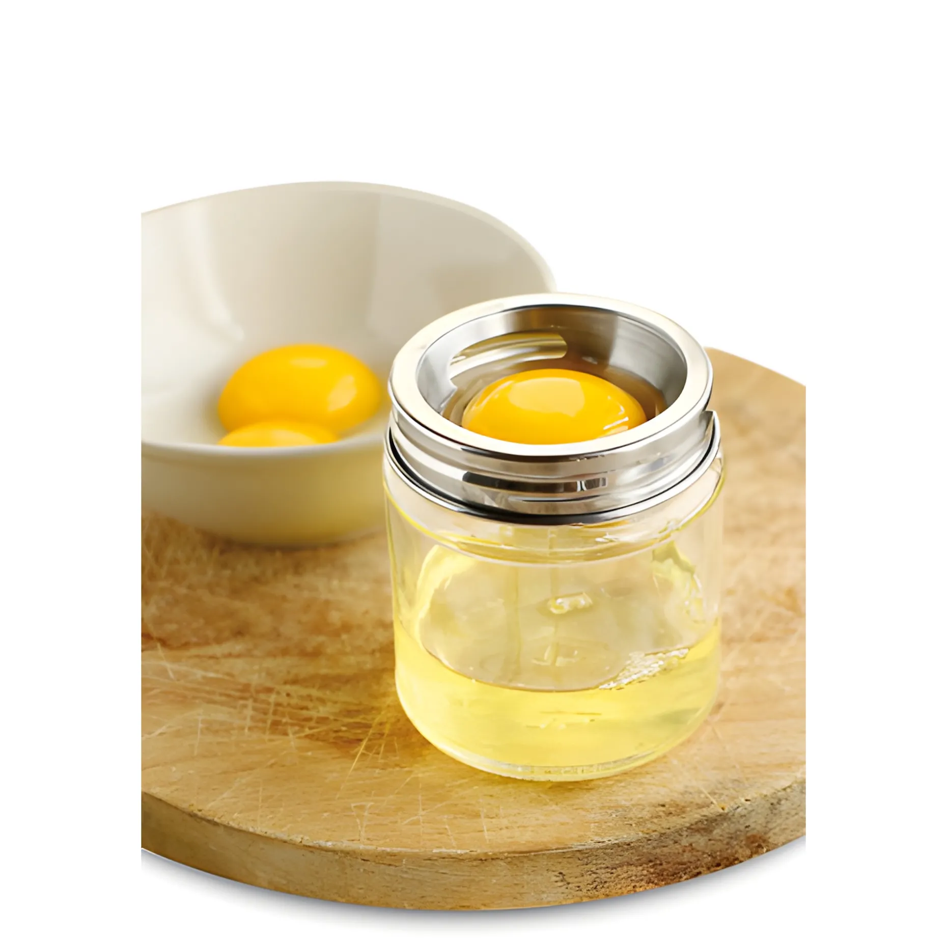 Mit diesem praktischen Küchenhelfer ist das Eier Trennen kein Problem mehr. Der Edelstahl-Schraubdeckel ist der perfekte Eiertrenner, bei dem das Eiweiß im Glas aufgefangen wird und das Eigelb separat im Deckel bleibt.