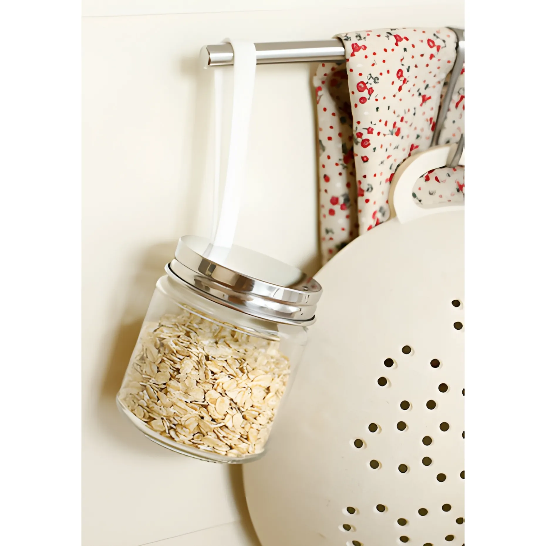 Praktischer Schraubverschluss mit Silikonband für Vorratsgläser. Das weiße elastische Band sorgt für einen effektiven Halt und ermöglicht es, Gläser an Küchenhaken, Stangenhalterungen oder in anderen Räumen platzsparend aufzuhängen. So hat man einen guten Überblick und gleichzeitig alles sofort griffbereit.