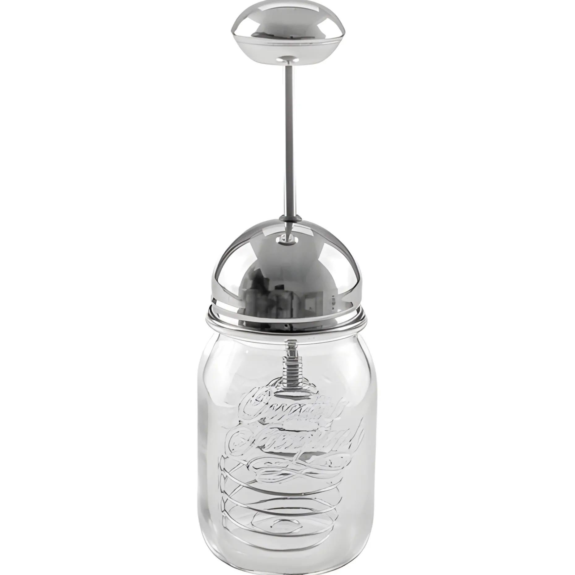 Der Schraubdeckel aus Edelstahl ist eine Konstruktion aus Verschluss und Schaumschläger, der durch einen handlichen runden Knauf bedient wird. Eine Mengenangabe für die Schlagsahne ist auch mit dabei. Diese finden Sie auf der Verpackung, wo Schritt für Schritt erklärt wird, wie leicht und schnell die Zubereitung im Glas funktioniert.