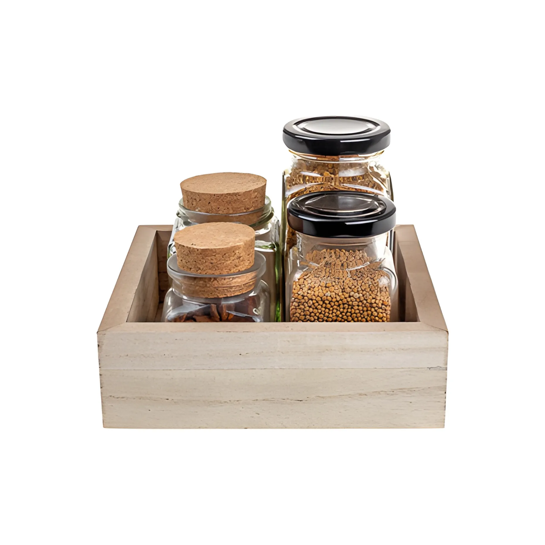 Praktische Holzkiste für Ihre Gewürzorganisation. Die rechteckige Kiste sorgt für Ordnung im Kräuter- und Gewürzregal und sieht dabei auch einfach klasse aus. Hier finden vor allem kleine Korkengläser, Cubis und Gewürzstreuer ihren Platz, die auch gleich griffbereit sind. Dank ihrer handlichen Größe passen auch mehrere Kisten in den Schrank, die bei Bedarf einfach herausgezogen werden können.