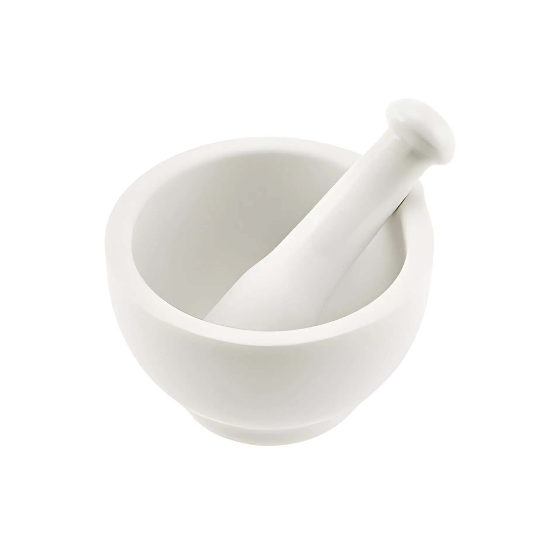 Mörser mit Ausgusslippe und passendem Stößel aus Porzellan. Die Außenseite und das Griffstück sind für angenehmen Halt glasiert, die Innenseite des Mörsers und der untere Teil des Stößels sind naturbelassen, damit Kräuter und Gewürze optimal zerkleinert werden können. Die Größe des Mörsers ist sehr handlich und er eignet sich auch für kleinere Portionen.