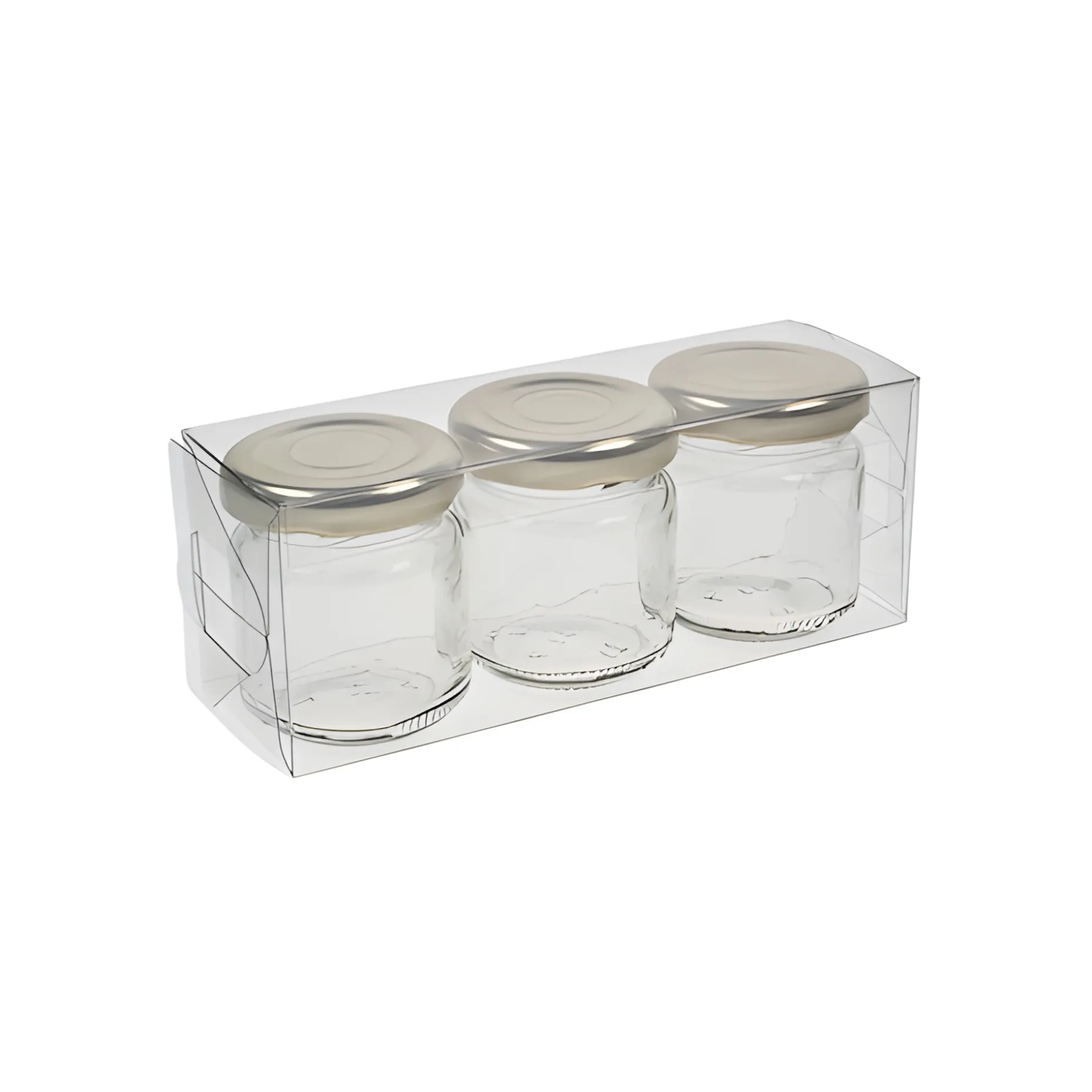 Die hochwertige, transparente Klarsichtschachtel ist eine schöne Geschenkverpackung für 3 Minigläser, die darin dekorativ nebeneinandergestellt werden können.