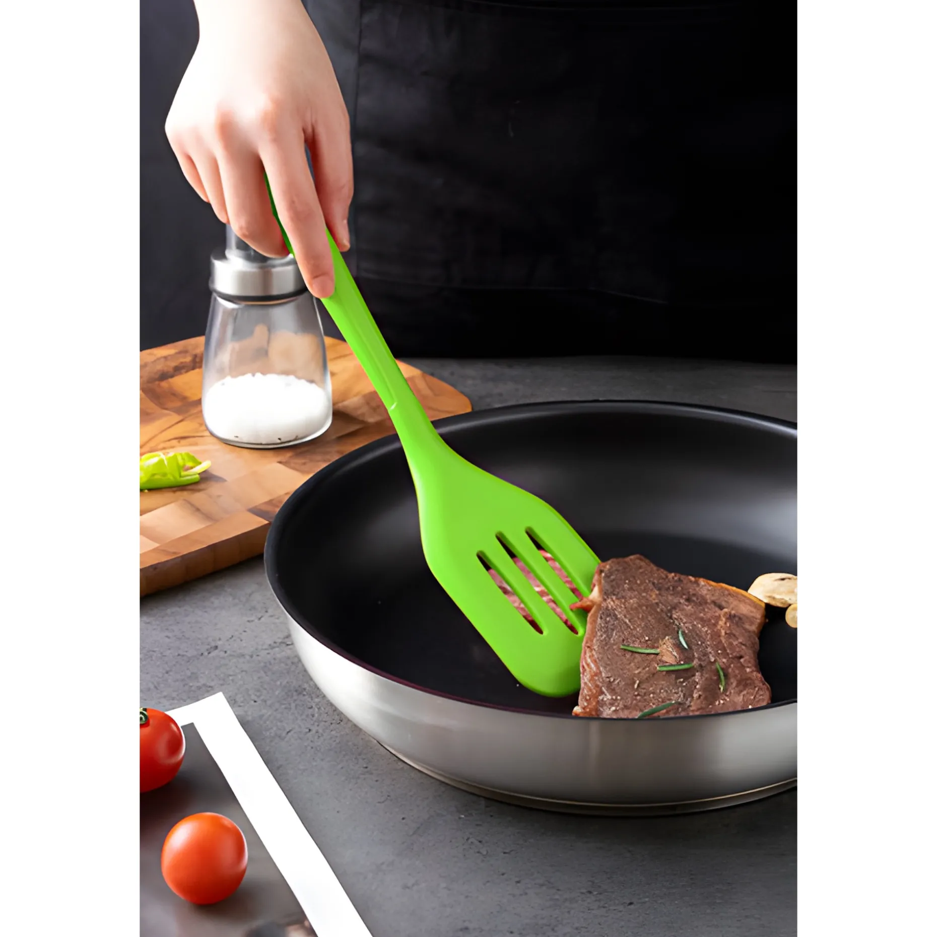 Die drei Schlitze des Silikonspatels verhindern, dass ungewollt größere Mengen an Fond oder Bratfett aus der Pfanne genommen werden, und bieten zusätzliche Flexibilität. Das lebensmittelechte Silikon ermöglicht es, den Schlitzspatel ohne Bedenken im Topf oder in der Pfanne liegen zu lassen, ohne dass man sich am Griff verbrennt. Der Griff hat ein Loch, an dem man den limettengrünen Flex-Wender aufhängen kann, um ihn immer schnell zur Hand zu haben.