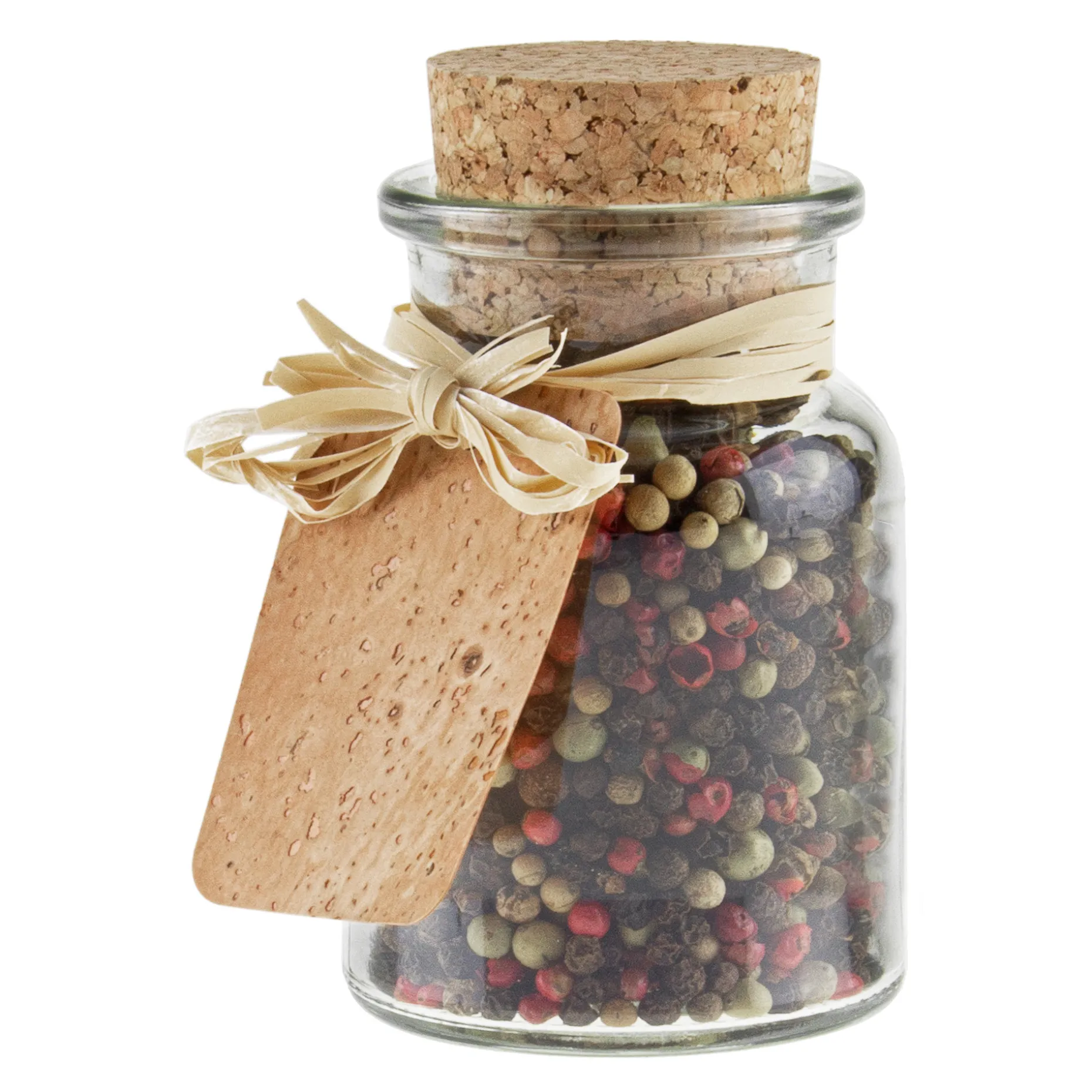 Das kleine, runde Korkenglas eignet sich super zum Aufbewahren von trockenen Lebensmitteln wie Tee, Kandis, Bonbons oder Nüssen. Mit einem Füllvolumen von 150 ml ist es ideal für Kräuter und Gewürze. Befüllt mit bunten Pfefferkörnern, getrockneten Chilis oder Wacholderbeeren, macht das hübsche Gewürzglas viel her und wertet jedes Vorrats- oder Gewürzregal optisch auf.