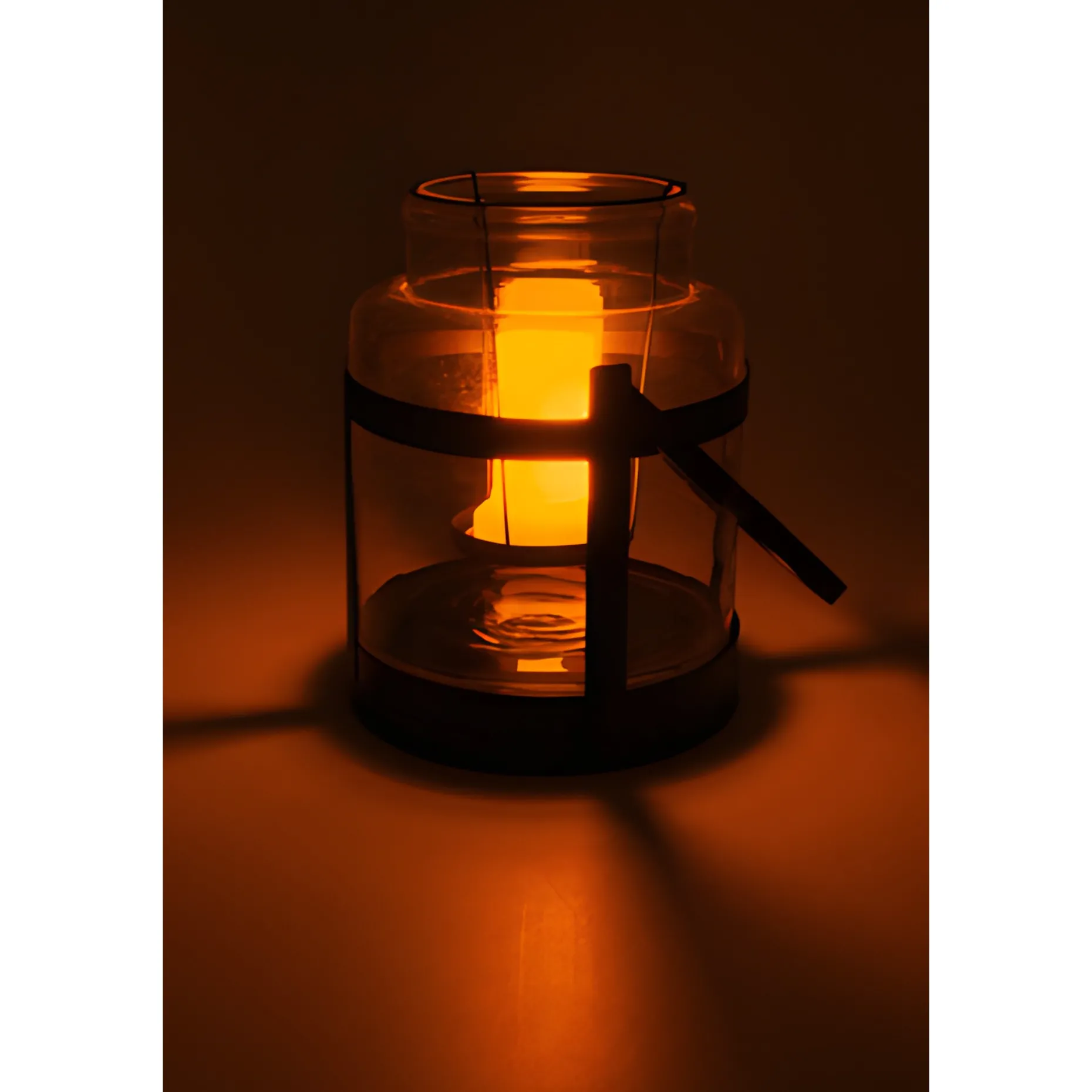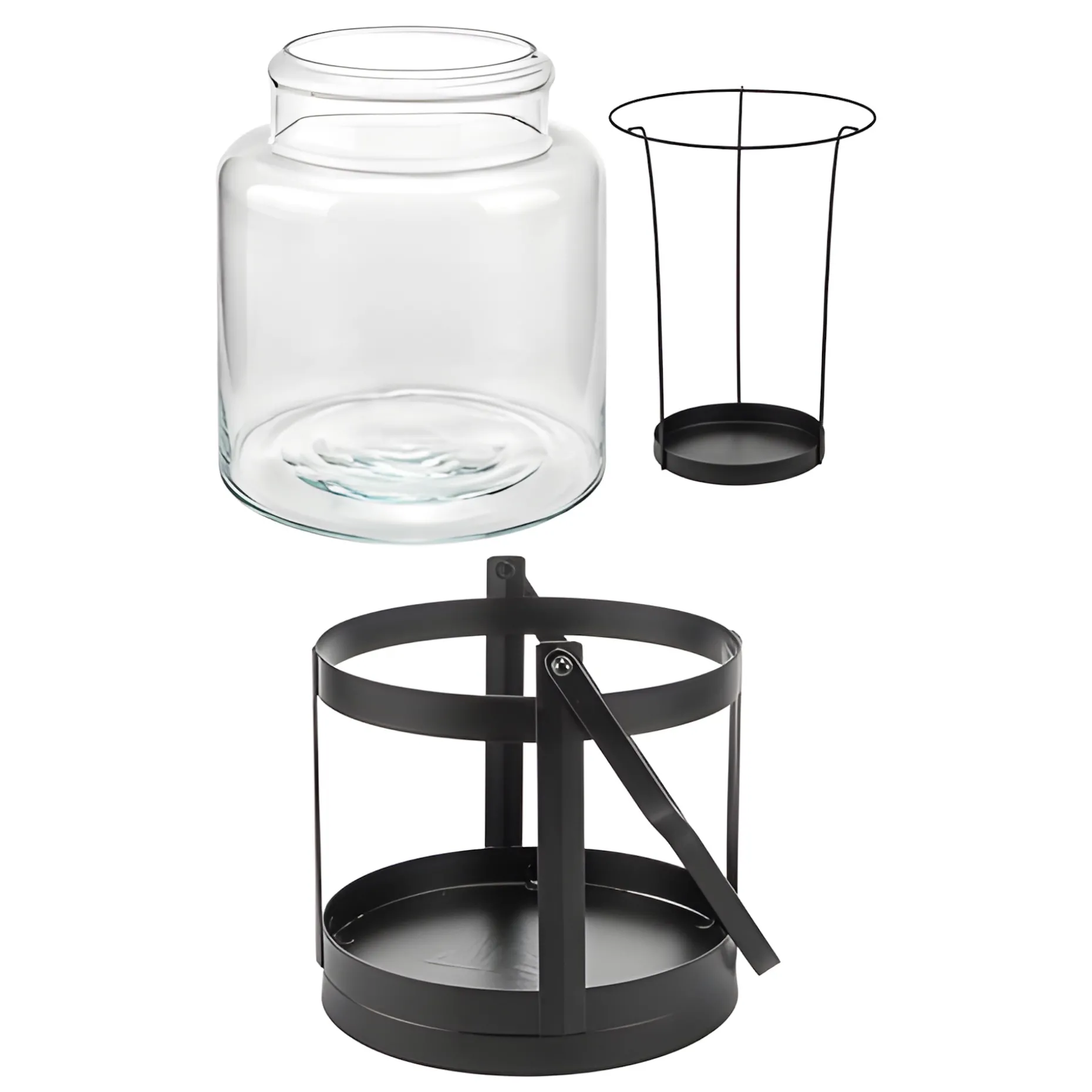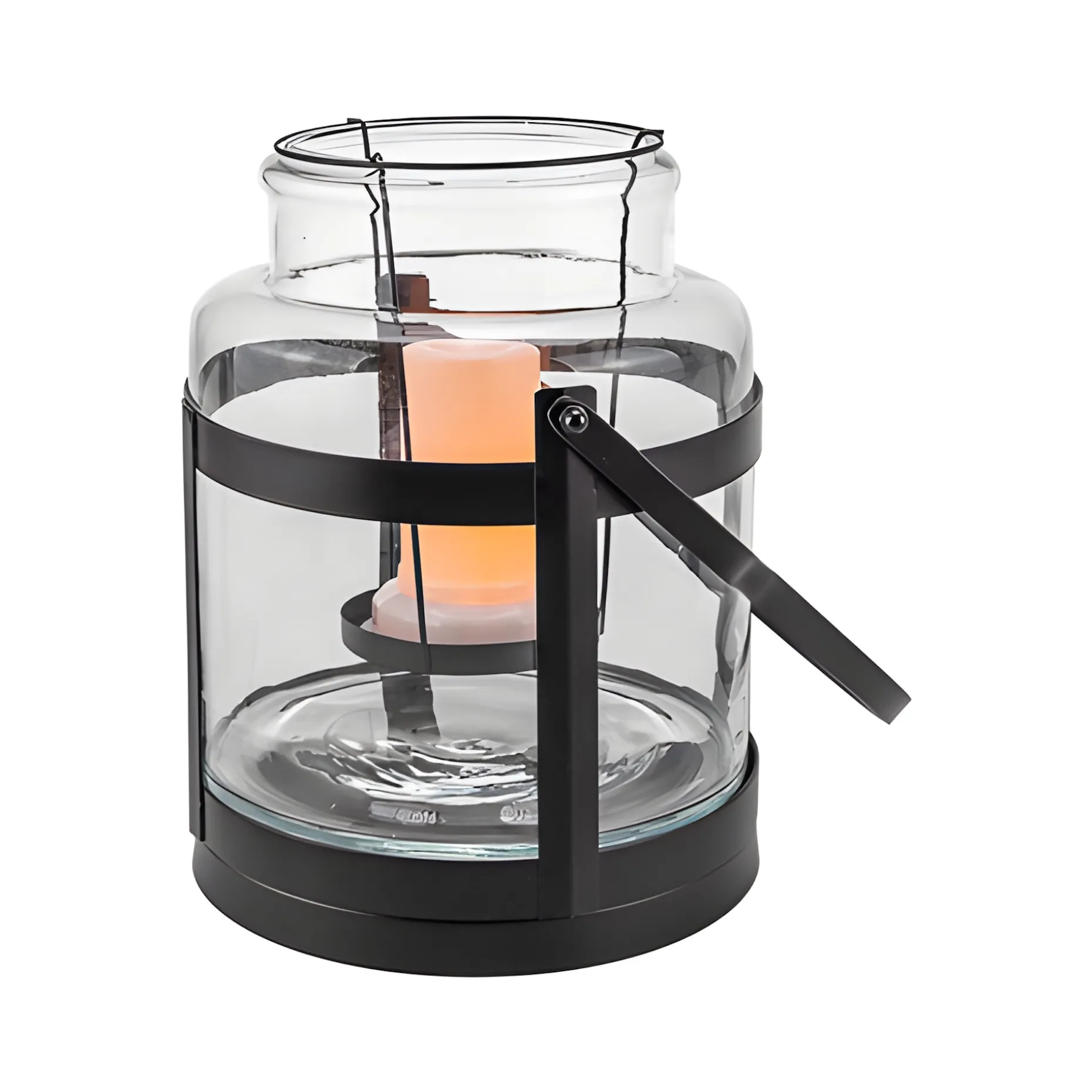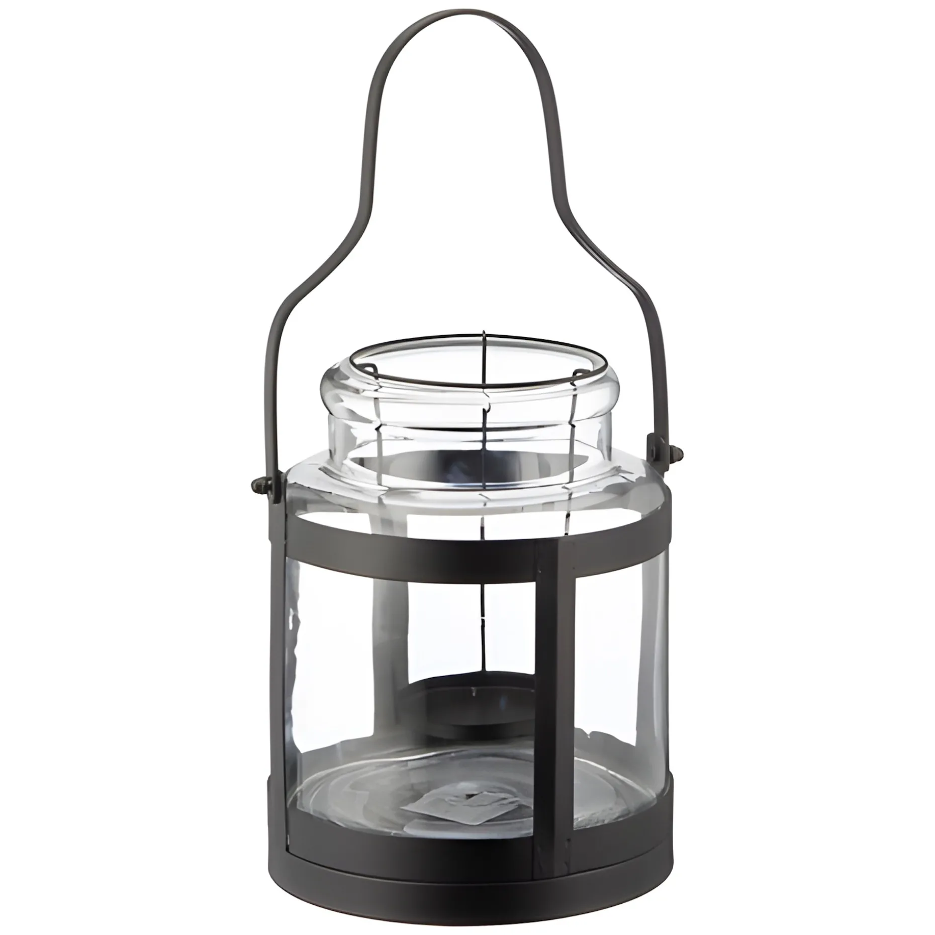 Dekoratives Laternen-Windlichtglas für Teelichter, Stumpenkerzen und LED-Leuchten. Das große Teelichtglas ist in eine schwarze Metall-Konstruktion mit einsetzbarer Kerzenhalterung eingelassen. Mit dem geschwungenen Griff kann das Glas überall hingestellt werden, wo es zu einem schönen Dekoelement wird. So haben Sie das ideale Windlicht, das im Wohnzimmer, auf der Terrasse, dem Balkon und im Garten eine tolle Figur macht.