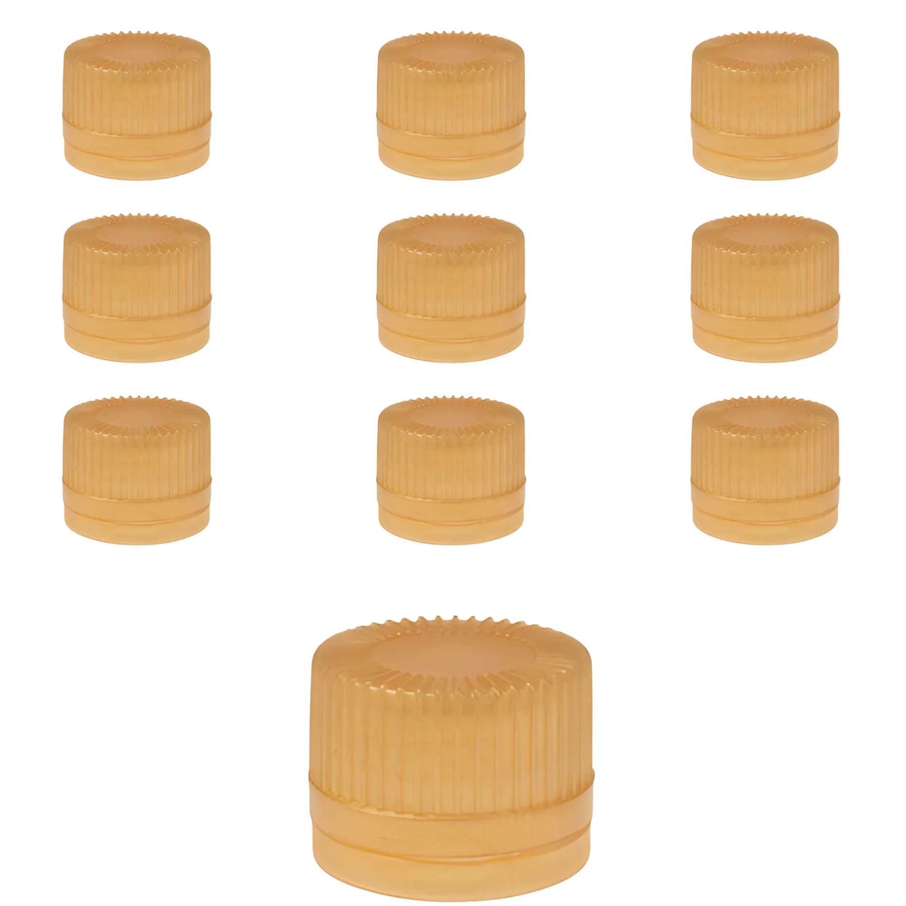 Der goldfarbene Schraubverschluss aus Kunststoff im praktischen 10er-Pack hat einen Abrissring zur Originalitätssicherung und passt auf alle Schraubflaschen mit einer PP 18-Mündung, z. B. auf kleine Probierflaschen wie die Kropfhalsflasche 40 ml, die Taschenflasche 20 ml oder die Geradhalsflasche 50 ml.