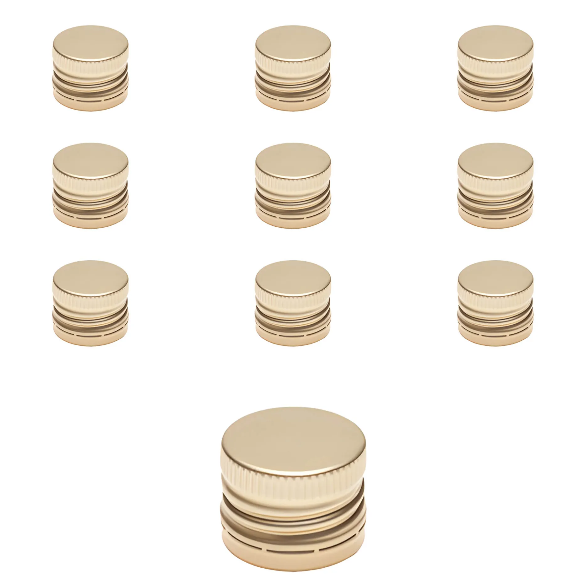 Der goldfarbene Schraubverschluss aus Aluminium im praktischen 10er-Pack hat einen Abrissring zur Originalitätssicherung und passt auf alle Schraubflaschen mit einer PP 28-Mündung, z. B. auf Geradhalsflaschen (ab 200 ml), die Pinta 350 ml und 500 ml SV, Taschenflaschen (ab 100 ml) und viele andere.