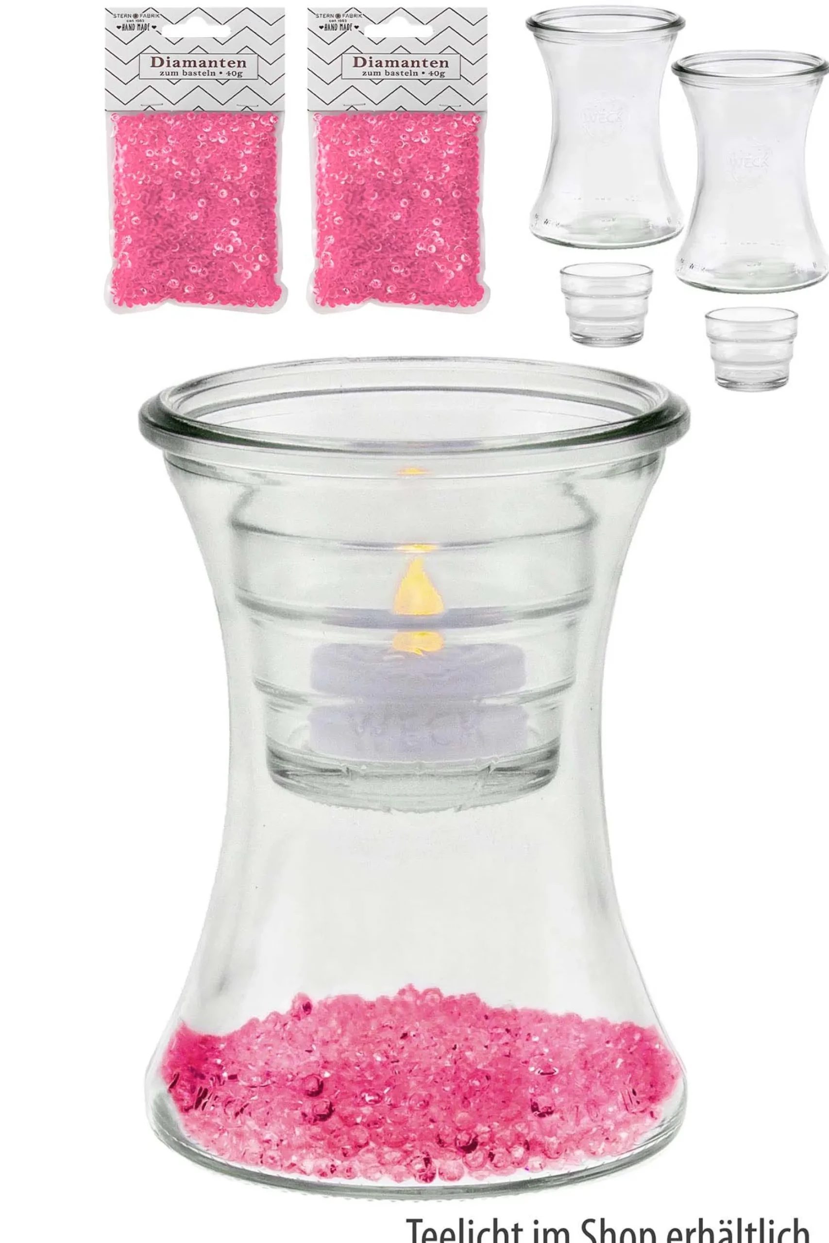Unsere Einkäuferin Sabine zeigte uns kürzlich, wie sie aus zwei Glasartikeln eine hübsche Glaslampe gebastelt hatte, die individuell dekoriert werden kann. In das vasenähnliche Weck-Glas werden die Deco-Diamanten eingefüllt. Diese kann man dann noch mit Trockenblüten, buntem Wasser oder anderen Dekomaterialien schmücken. Dann kommt der Teelicht-Universalhalter in das Glas, ein ganz übliches Teelicht wird eingesetzt und schon ist eine schmuckvolle Beleuchtung für drinnen und draußen entstanden!