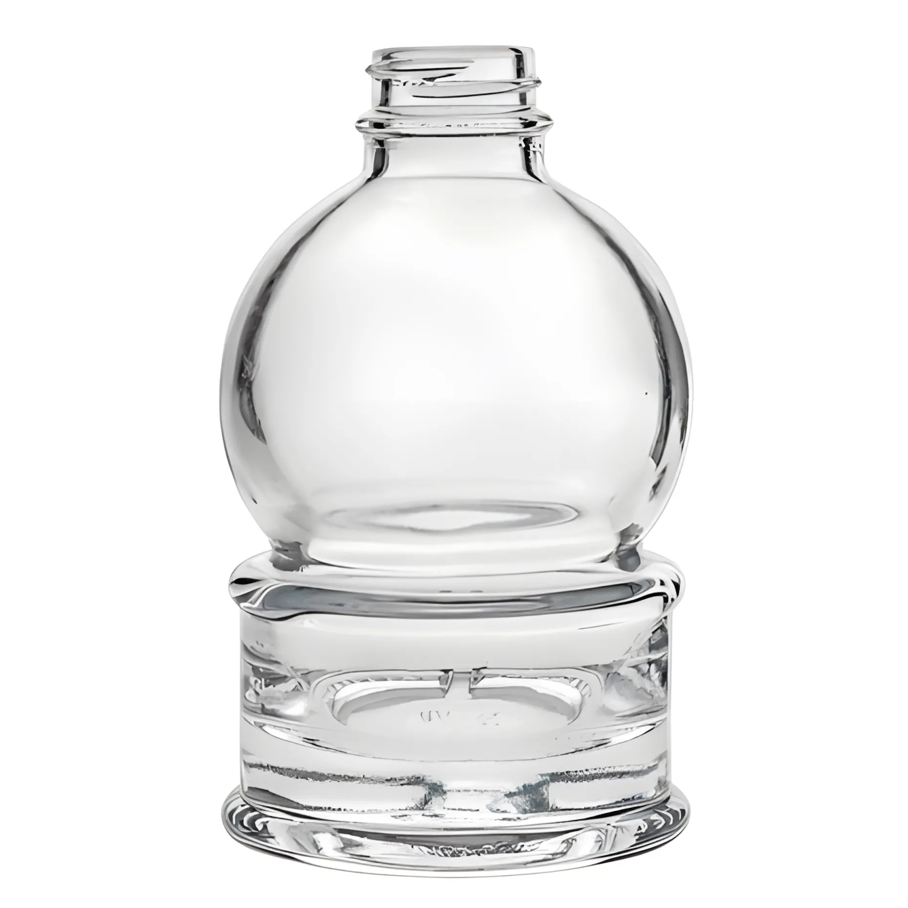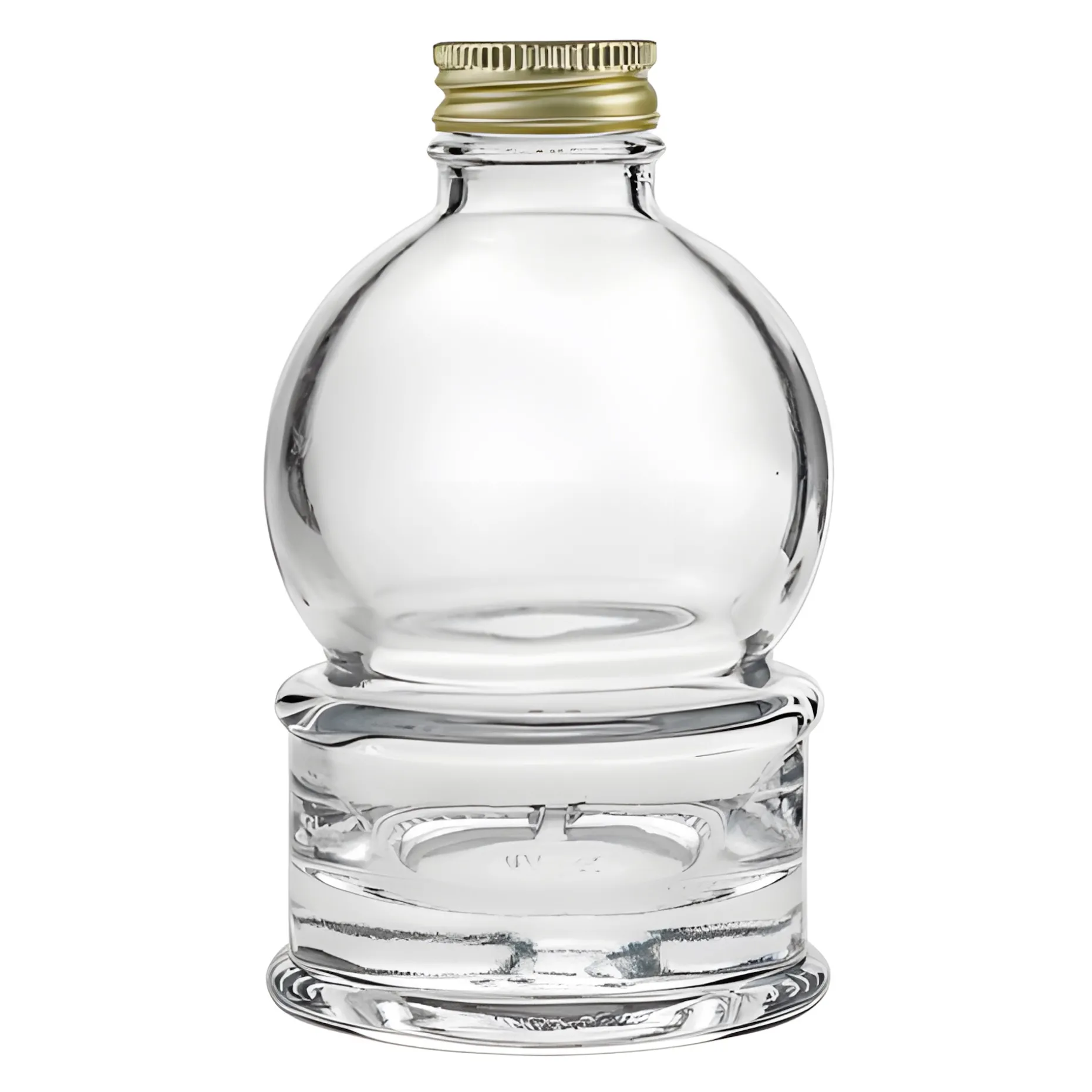 Die Glasflasche ist rund wie eine Schneekugel und hat einen schweren Fuß, der ihr einen sicheren Stand verleiht. Die Kugel sitzt auf einem geradlinigen Sockel mit einer umlaufenden Einkerbung, wodurch die Flasche gut zu greifen ist. Die Schneeball-Form macht sie zu einer originellen Schmuckflasche für selbstgemachte Köstlichkeiten und kommt besonders gut mit farbigen Inhalten wie z. B. rotem Granatapfelsirup oder goldgelbem Orangenlikör zur Geltung. Sie hat einen kurzen Hals mit einer GPI-Mündung für einen entsprechenden Schraubdeckel, der die Flasche luftdicht und auslaufsicher verschließt.