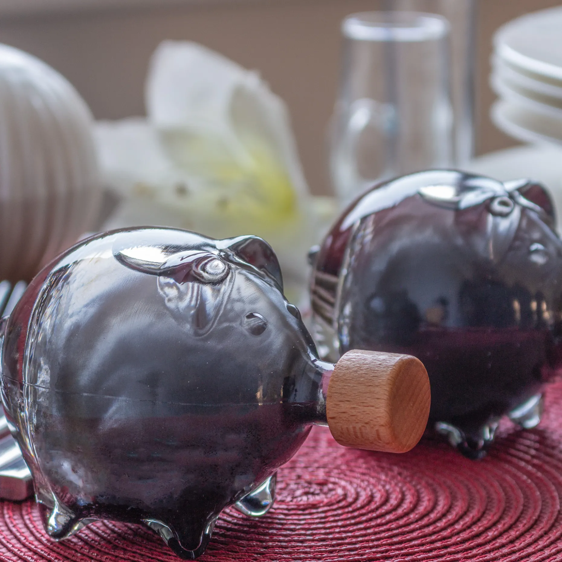 Dieses niedliche Fläschchen sieht aus wie ein Sparschwein, wird aber nicht mit Geld, sondern mit flüssigen Leckereien befüllt. Mit 100 ml Volumen ist es ideal für besondere Abfüllungen, kleinere Mengen Glückssirup oder Geschenke. Das dekorative Schweinchen kann auf drei verschiedene Arten hingestellt werden: aufrecht, auf allen Vieren oder sitzend.