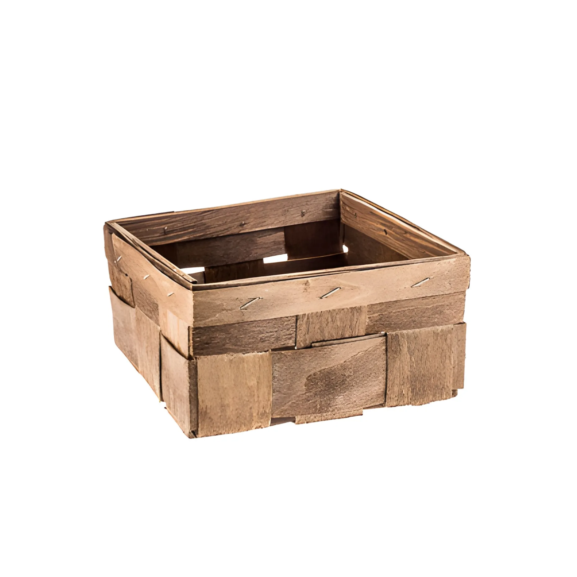 Quadratischer Spankorb, der sich gut als Geschenkkorb eignet. Mit Holzwolle oder Papiergras ausgelegt können kleine Gläser und Flaschen darin sehr schön präsentiert werden.