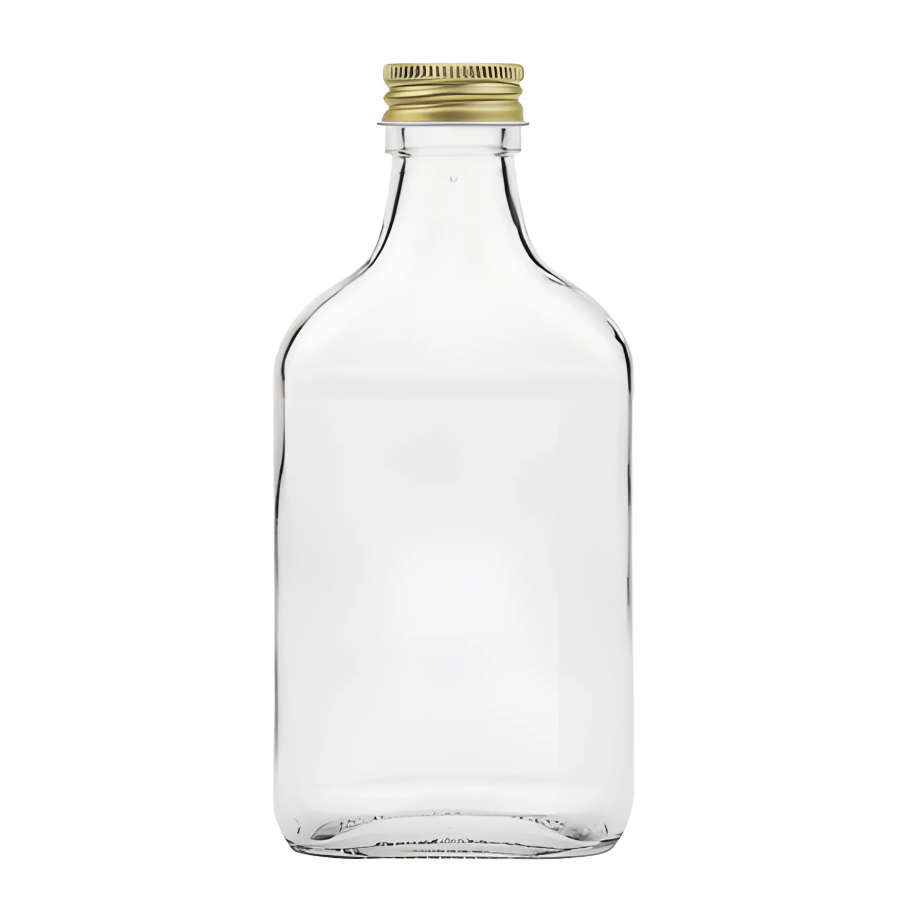 Die schlichte Flasche aus klarem, stabilem Glas hat eine flache Form und erinnert an einen klassischen Flachmann, den man sich unauffällig in die Tasche steckt. Sie hat eine Mündung für einen praktischen Schraubverschluss und kann auslaufsicher transportiert werden. Ideal zum Mitnehmen wärmender Spirituosen bei winterlichen Wanderungen oder zum Picknick.