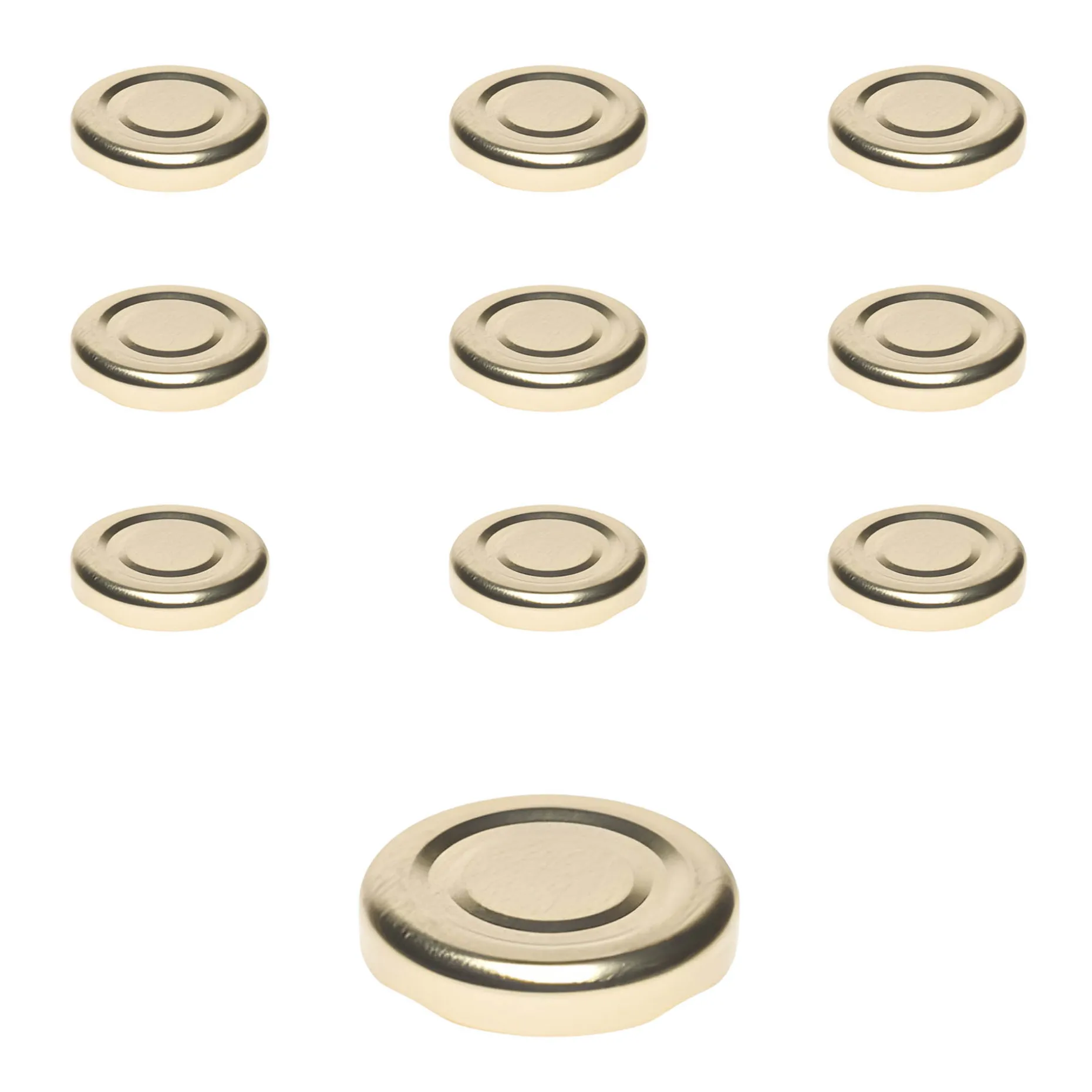 Goldfarbener Twist-Off-Verschluss, passend für Gläser und Flaschen mit TO 43 Mündung (äußerer Öffnungsdurchmesser des Glases ohne Gewinde ca. 37,9 mm), im praktischen 10er-Pack.