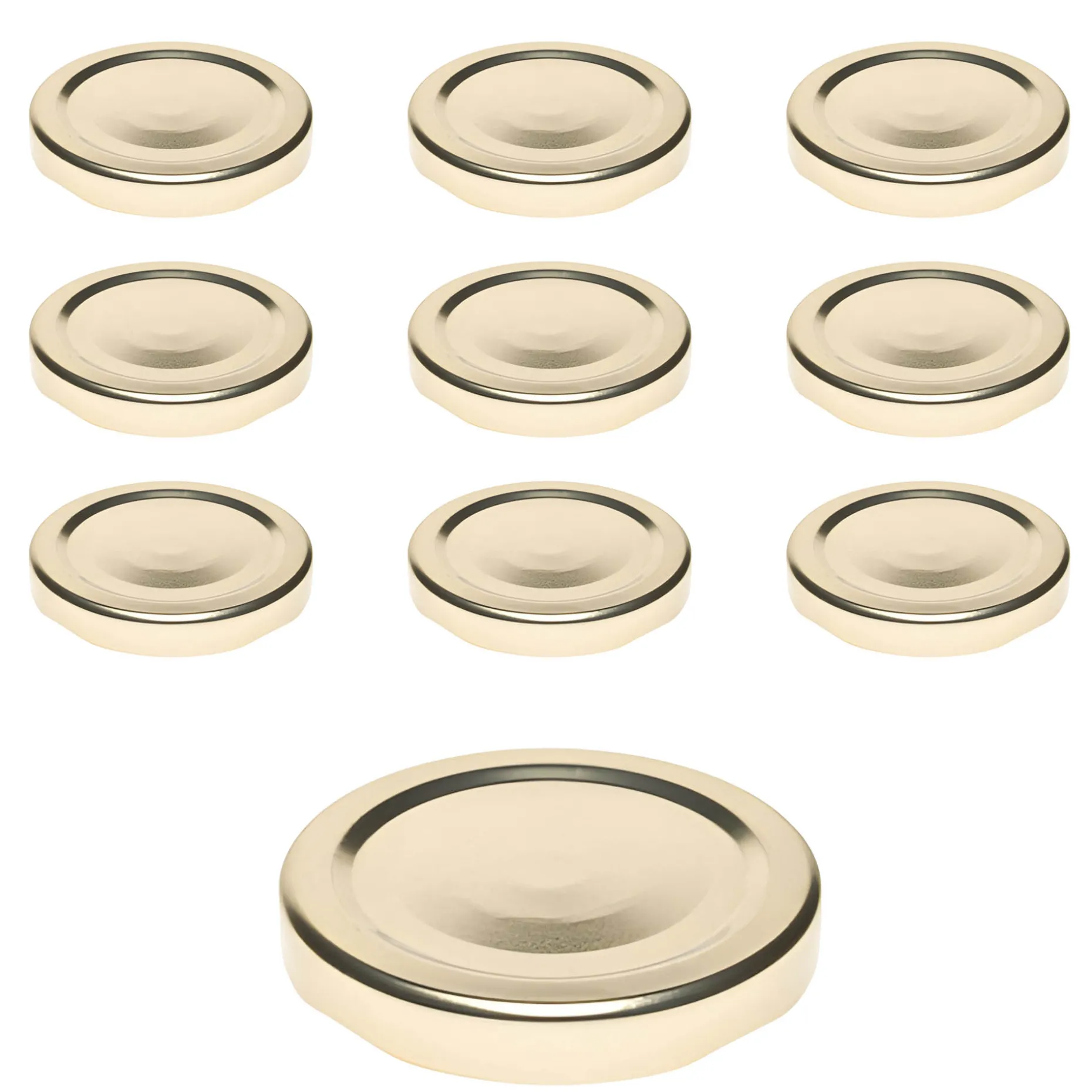 Hochwertiger Twist-Off-Verschluss in Gold mit Button, passend für Gläser und Flaschen mit einer TO 58 Mündung (äußerer Öffnungsdurchmesser des Glases ohne Gewinde ca. 52,8 mm), im praktischen 10er-Pack.