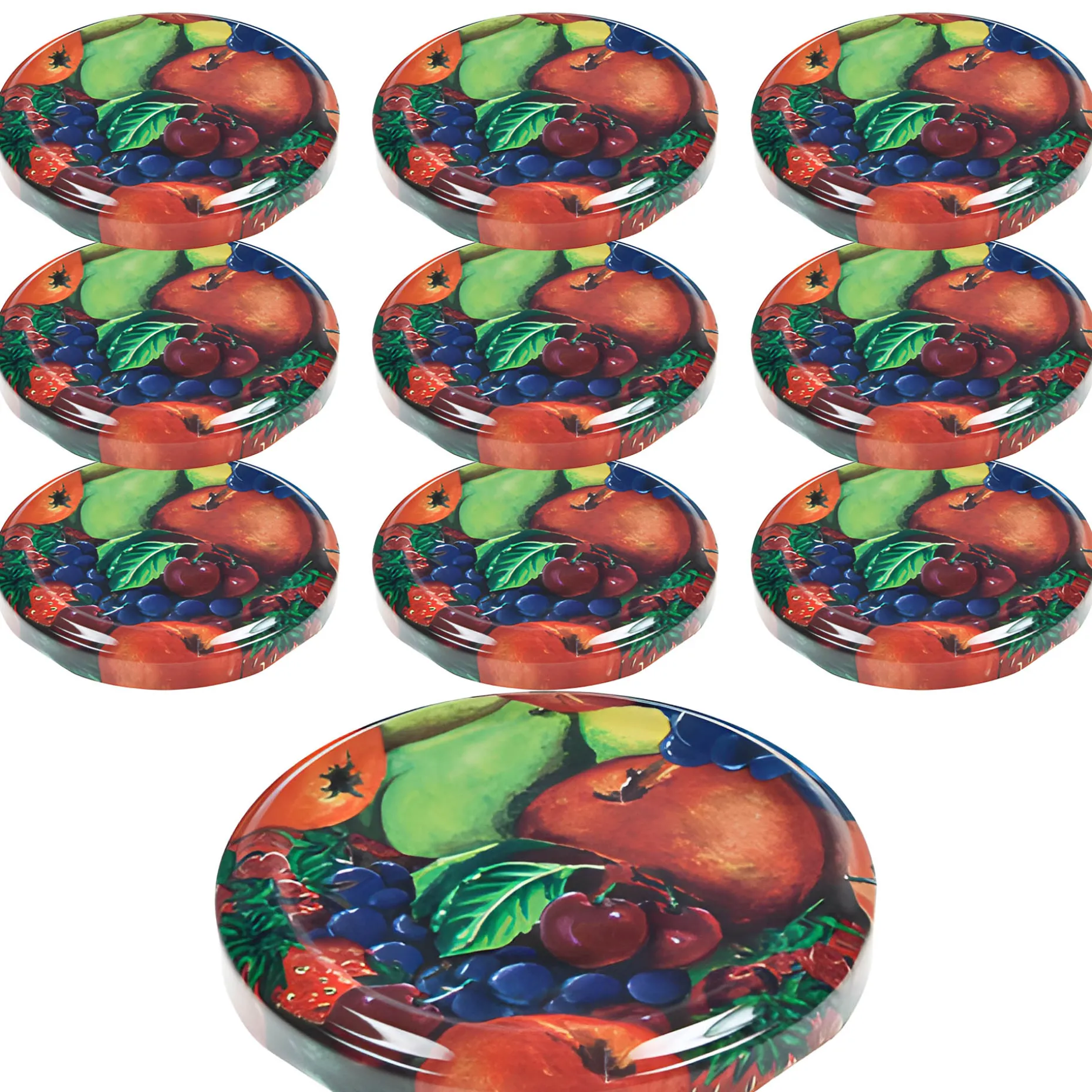 Hochwertiger Twist-Off-Verschluss mit Obstdekor und Button, passend für Gläser mit einer TO 66 Mündung (äußerer Öffnungsdurchmesser des Glases ohne Gewinde ca. 62 mm), im praktischen 10er-Pack.