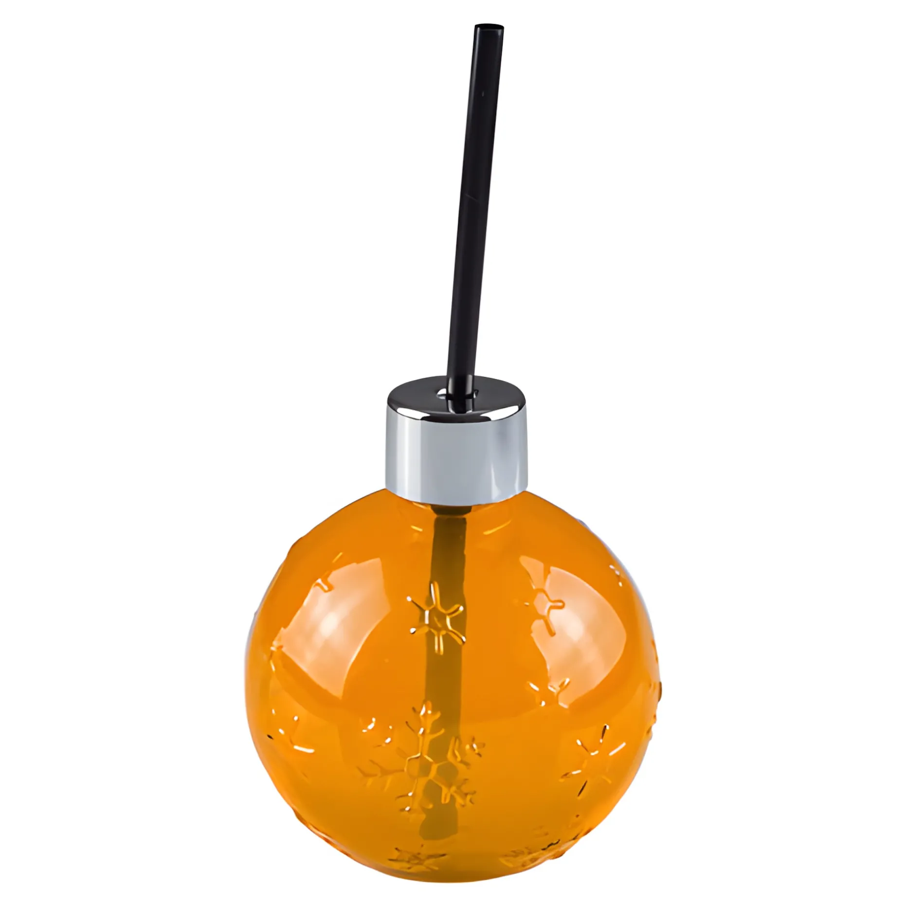 Das hübsche Trinkhalmglas hat eine reliefartige Oberfläche mit vielen kleinen Schneeflocken. Es besitzt eine Schraubmündung mit einem silberfarbenen Trinkhalmdeckel sowie stabilem Trinkhalm und ist nicht nur schön anzusehen, sondern auch sehr praktisch. Durch seine kugelrunde Form liegt es gut in der Hand. Die Getränke können direkt aus dem Glas geschlürft werden und sind gut geschützt. Der Inhalt kann beim Herumlaufen nicht herausschwappen, und fällt das Glas einmal um, stürzt die Flüssigkeit nicht gleich heraus. Ideal für Weihnachtsfeiern. Schraubt man den Deckel ab, kann das Glas auch als hübsche Vase für weihnachtliche Tischdekorationen verwendet werden.
