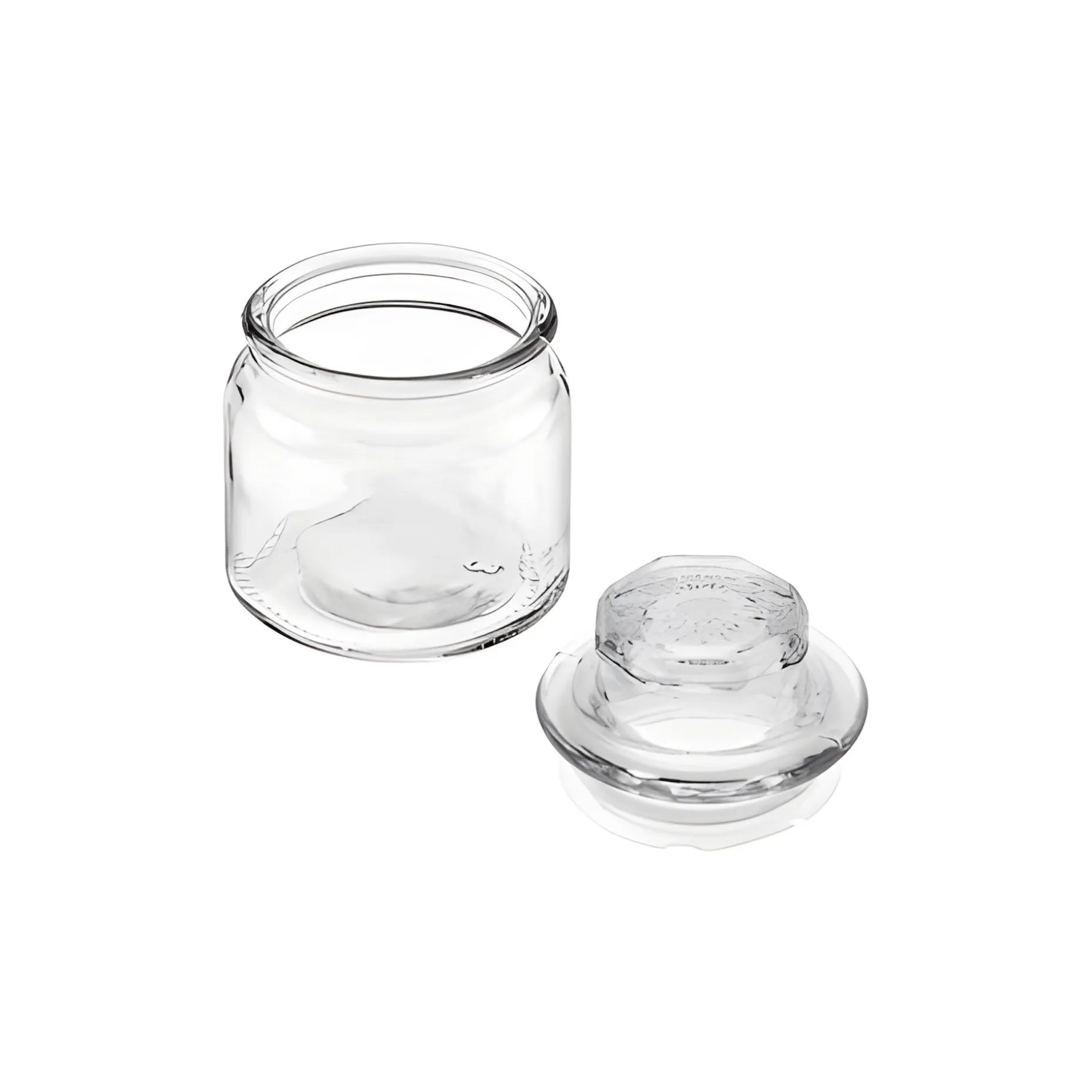 Eleganter kleiner Glasbehälter mit Glasstopfen, der ein Schmuckstück in Ihrer Vitrine sein könnte. Der Glasdeckel hat einen achteckigen Knauf – dessen Oberfläche Facetten zieren – und eine Kunststoffdichtung, um einen optimalen Halt auf dem Glas zu sichern. So können Kräuter und Gewürze luftdicht aufbewahrt und zum Blickfang im Küchenregal werden.