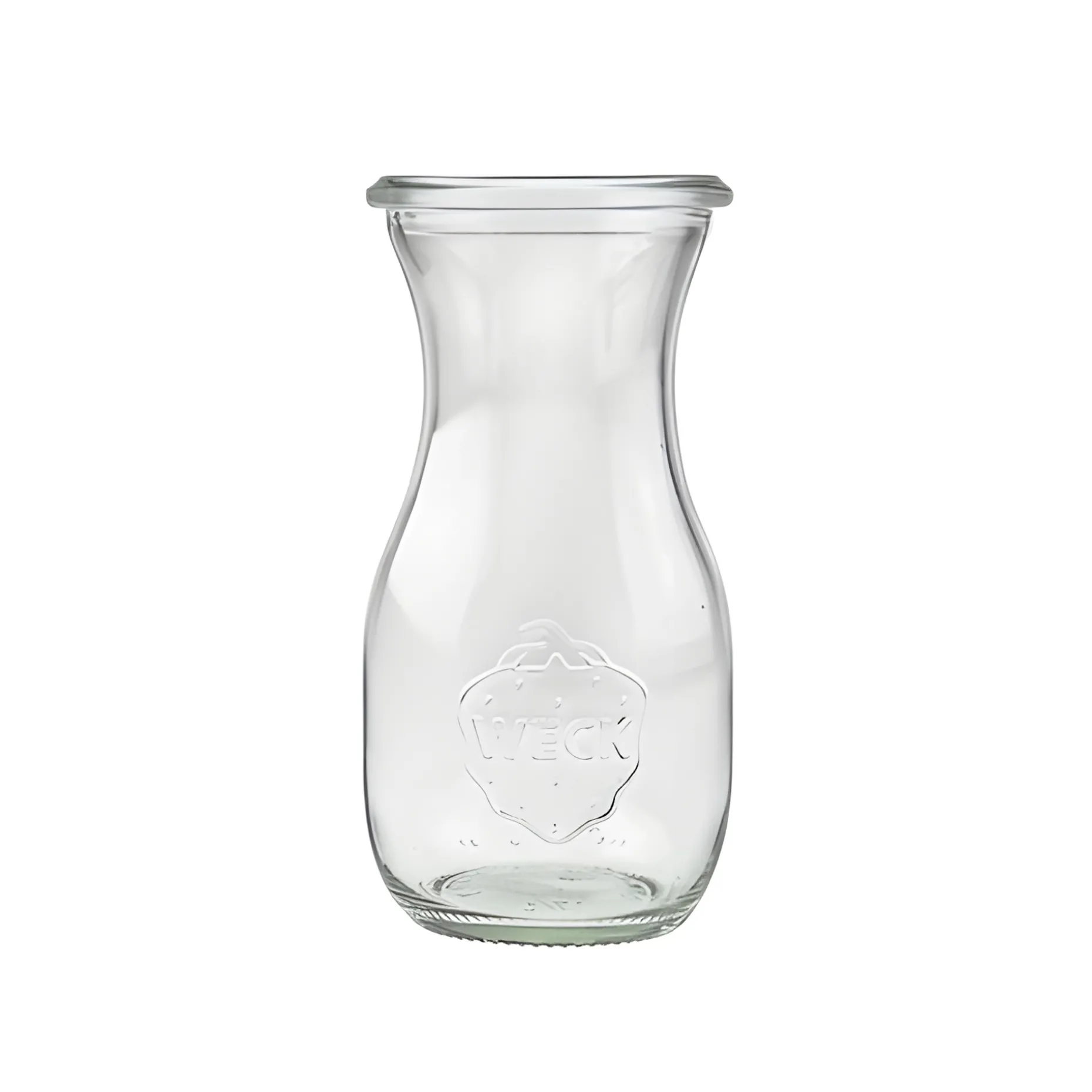 Die kleine Saftflasche mit einer RR 60-Mündung aus dem Hause WECK eignet sich wunderbar zum Einkochen von Saft, Sirup oder Brühe. Durch ihre klassische, schöne Form mit weiter Öffnung macht sie sich auch sehr gut als Karaffe für Wein und Wasser auf dem Esstisch. Etwa 250 ml Flüssigkeit können in die hübsche Einmachflasche mit dem WECK-Logo abgefüllt werden, perfekt auch für Smoothies und Soßen.