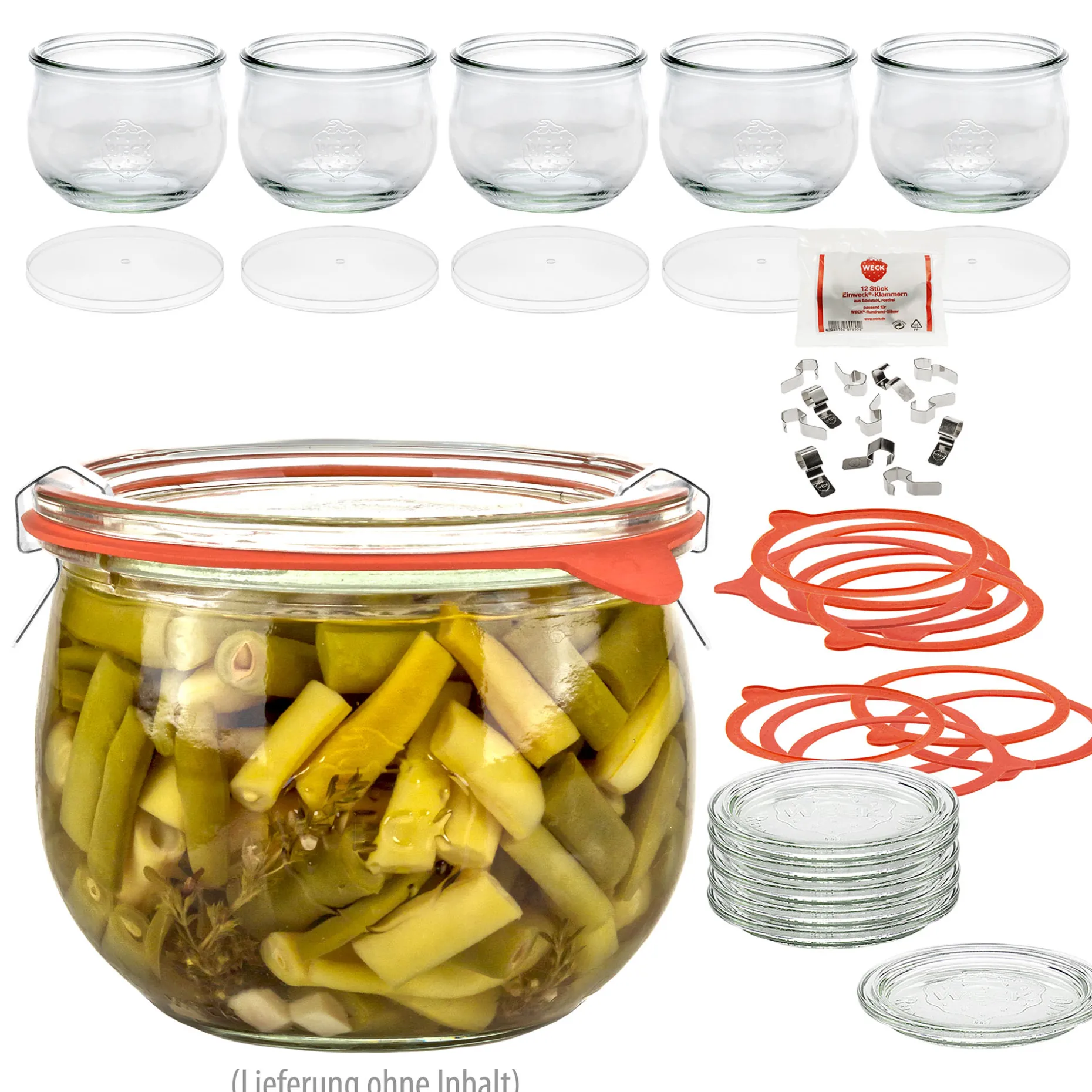 Durch die im Set enthaltenen traditionellen WECK-Verschlüsse wie Metallklammern und mit roten Gummiringen können Obst, Gemüse und auch Fertiggerichte super eingekocht werden. Mit den Frischhaltedeckeln lassen sich die vorbereiteten Speisen prima im Kühlschrank aufbewahren und transportieren. Tun Sie sich etwas Gutes, bereiten Sie Ihre Gerichte für die Mittagspause oder für unterwegs selbst vor und nehmen Sie Ihr Selbstgemachtes im Glas mit. Das ist viel leckerer, gesünder und nachhaltiger. Unser Set ist ideal dafür und bietet Ihnen viele Möglichkeiten.