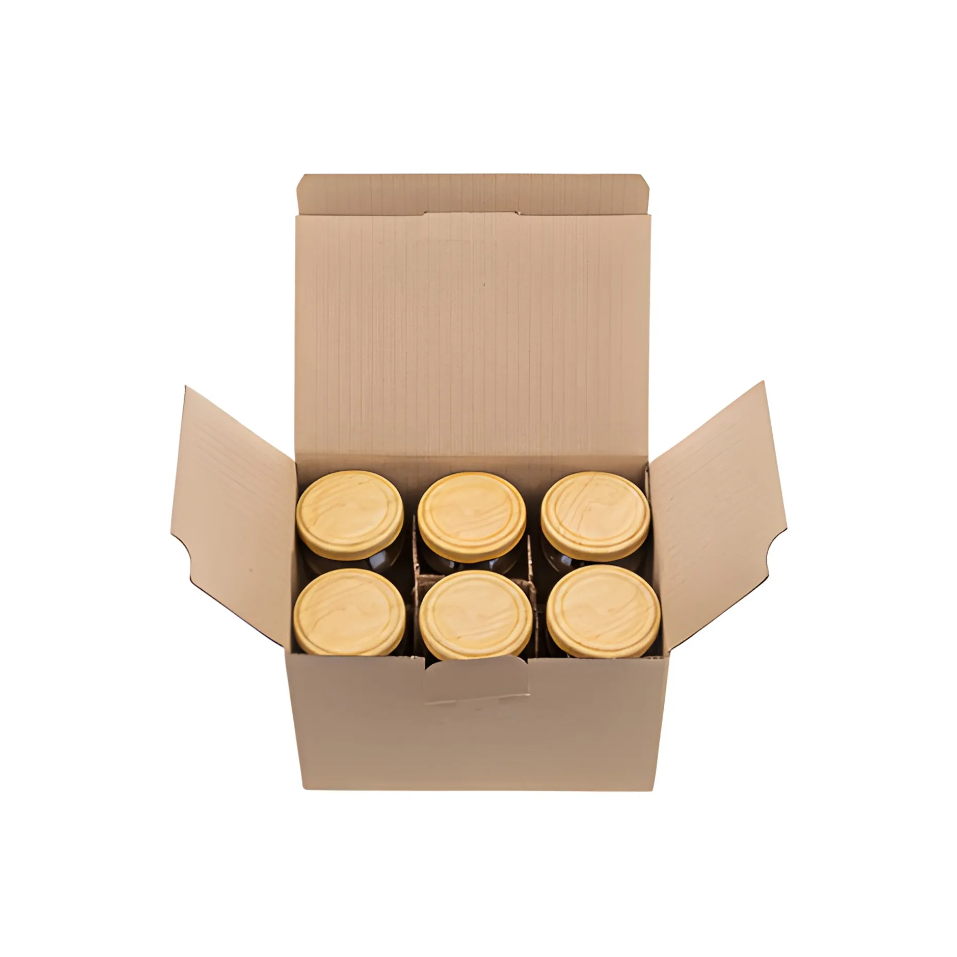 Praktischer Verpackungskarton für 6 kleine Vorrats- und Einmachgläser, die in den entsprechenden Fächern ideal verstaut werden können, ohne dass sie sich berühren. Dadurch sind sie bruchsicher verpackt und für den Transport bereit.