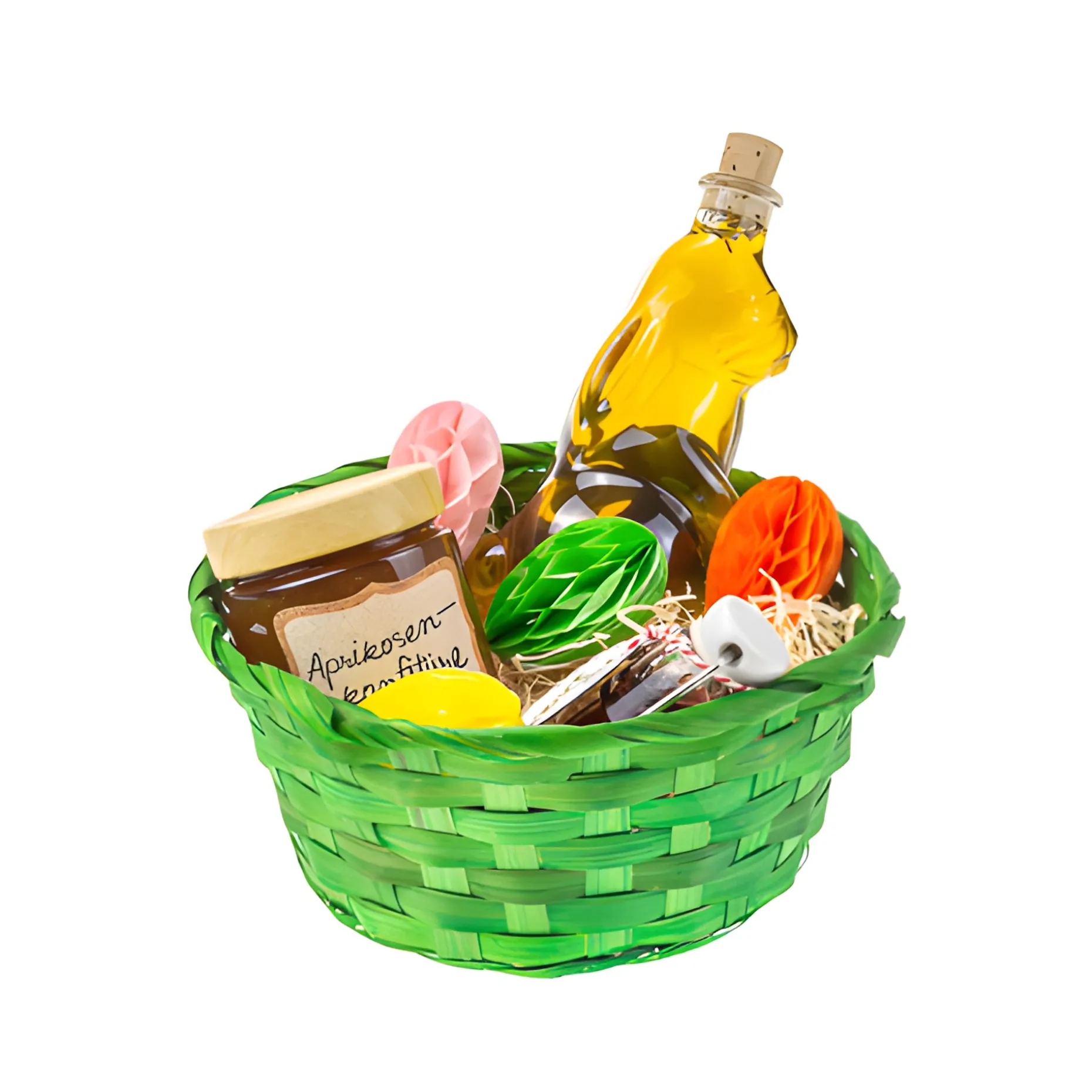 Die runde Korbschale aus Bambus eignet sich perfekt als Osterkörbchen, ausgelegt mit Holzwolle oder Papiergras und mit bunten Eiern befüllt verwandeln Sie die hübsche Schale im Handumdrehen in ein Osternest. Auch als Geschenkkorb, gefüllt mit selbstgemachten Köstlichkeiten, macht sich das Körbchen sehr gut, denn er passt auch in den Diamantbeutel 110 x 600 mm und kann so einfach und dekorativ verpackt werden.