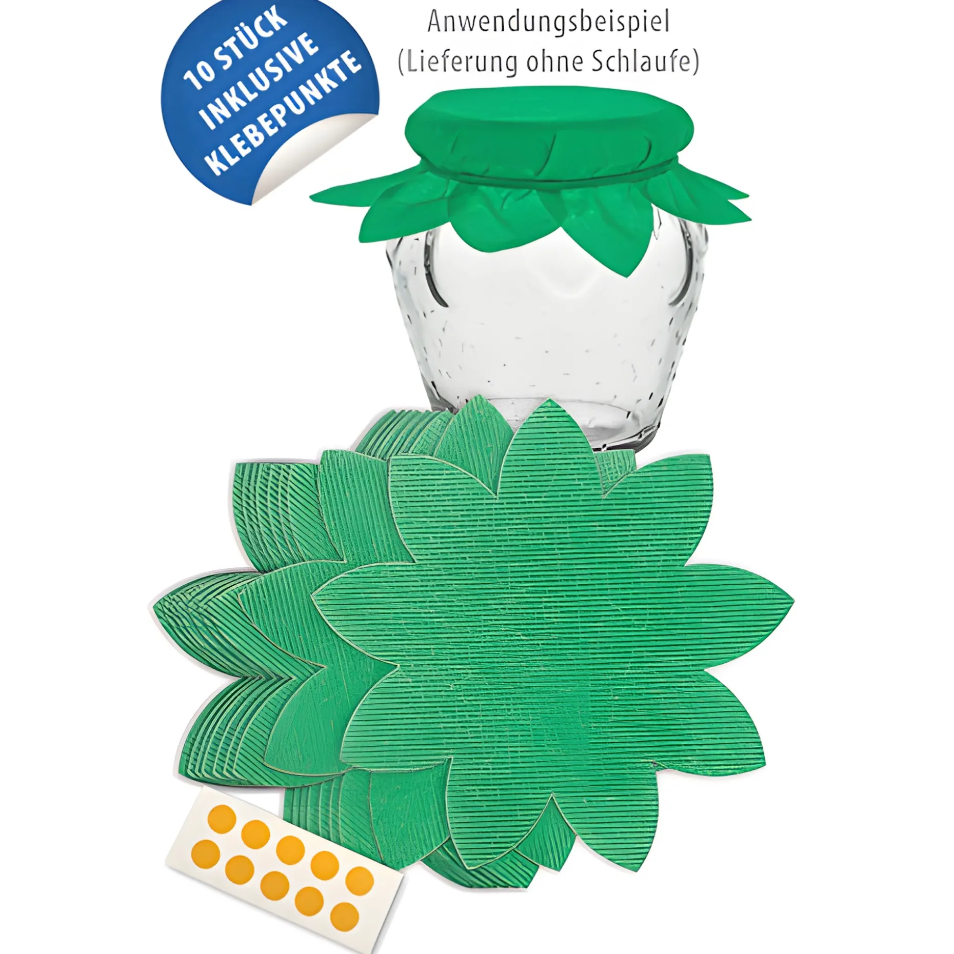 Dieses Vlies-Deckeldeckchen verleiht einem Marmeladenglas eine Optik, als hätte es einen Blätterkranz. Ist der Inhalt rot, könnte man fast meinen, es sei eine Erdbeere. Befestigt mit einem hübschen Band und etwas liebevoll dekoriert, sieht Ihr Marmeladenglas wie ein echtes Schmuckstück aus!