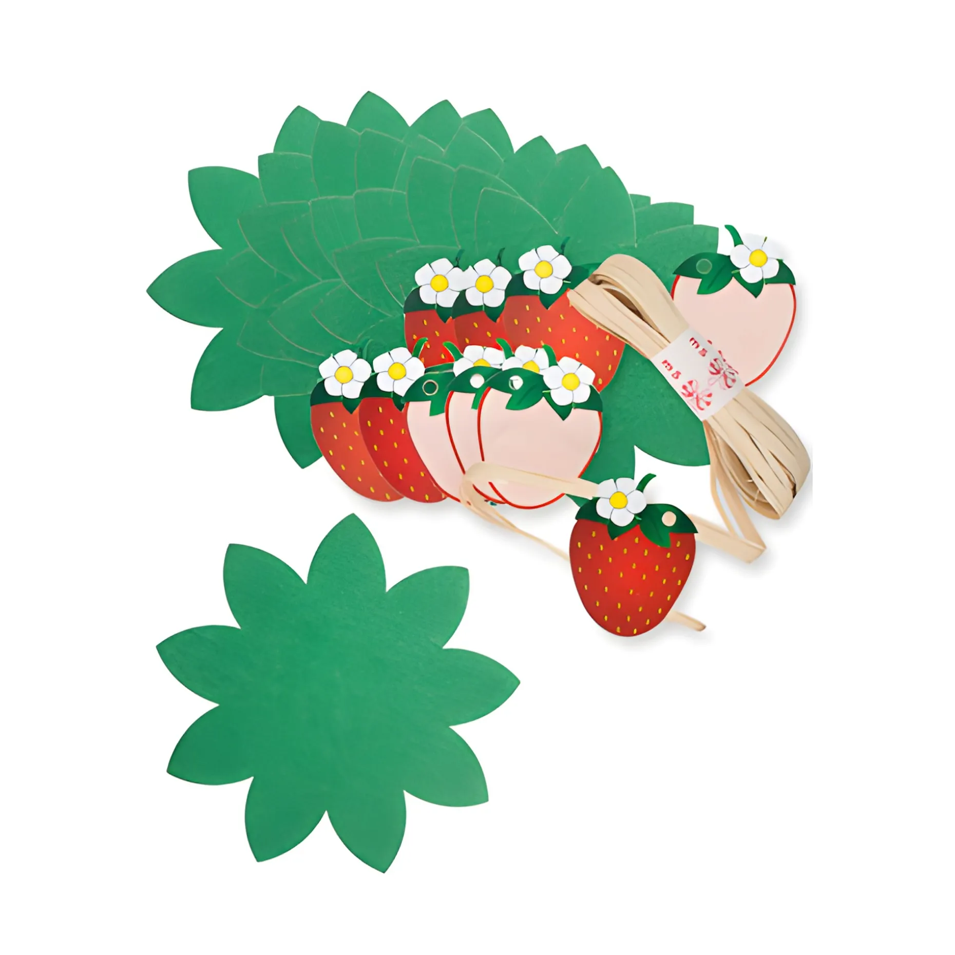 Im Set enthalten sind 10 Blattdeckchen sowie 10 Erdbeeranhänger und 5 Meter Faser-Raffiaband.
