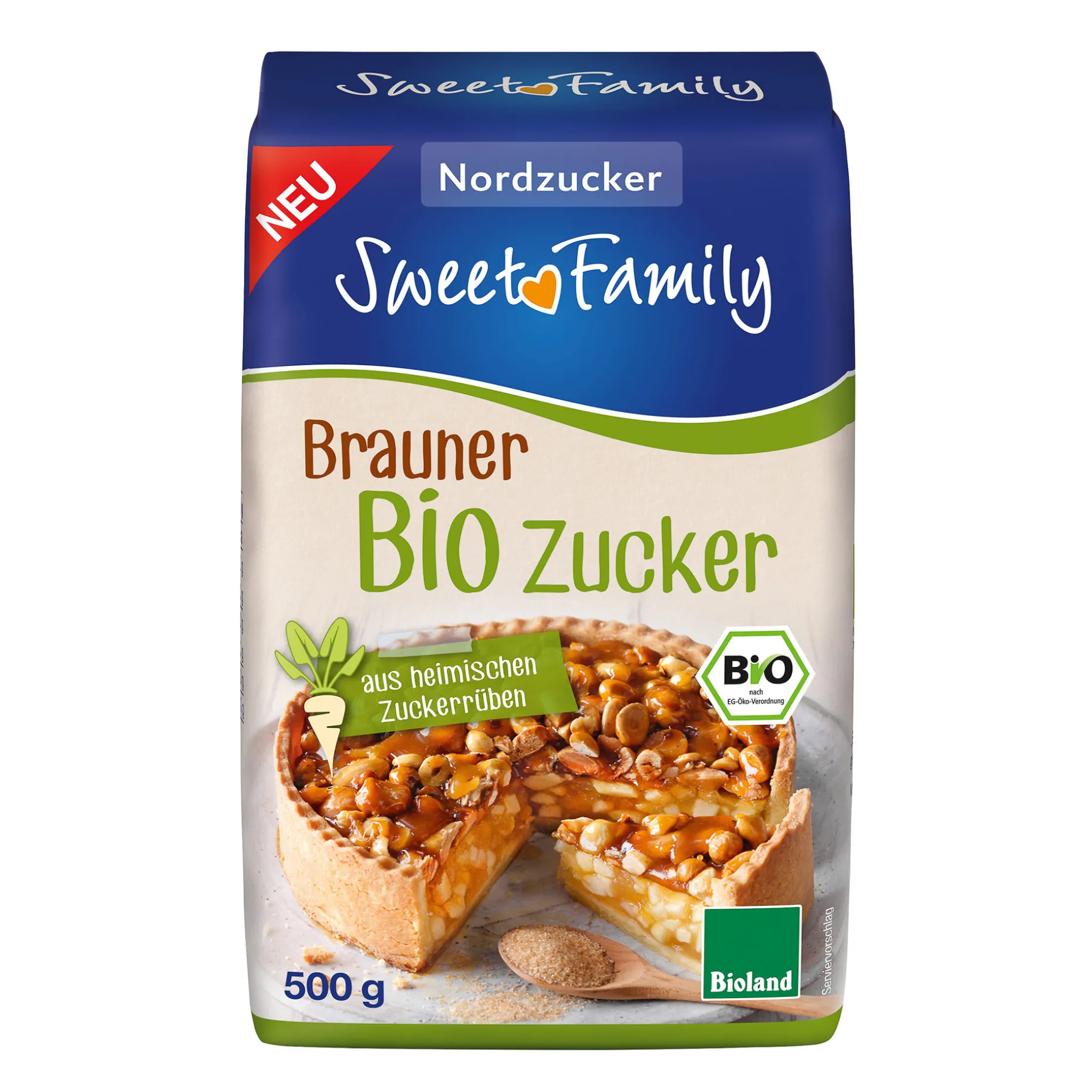 SweetFamily Brauner Bio-Zucker vereint Ökoqualität mit Regionalität. Der dafür verwendete Zucker wird ausschließlich aus heimischen Bio-Zuckerrüben gewonnen und ist nach den europäischen Standards bzw. nach den Bioland-Richtlinien zertifiziert.