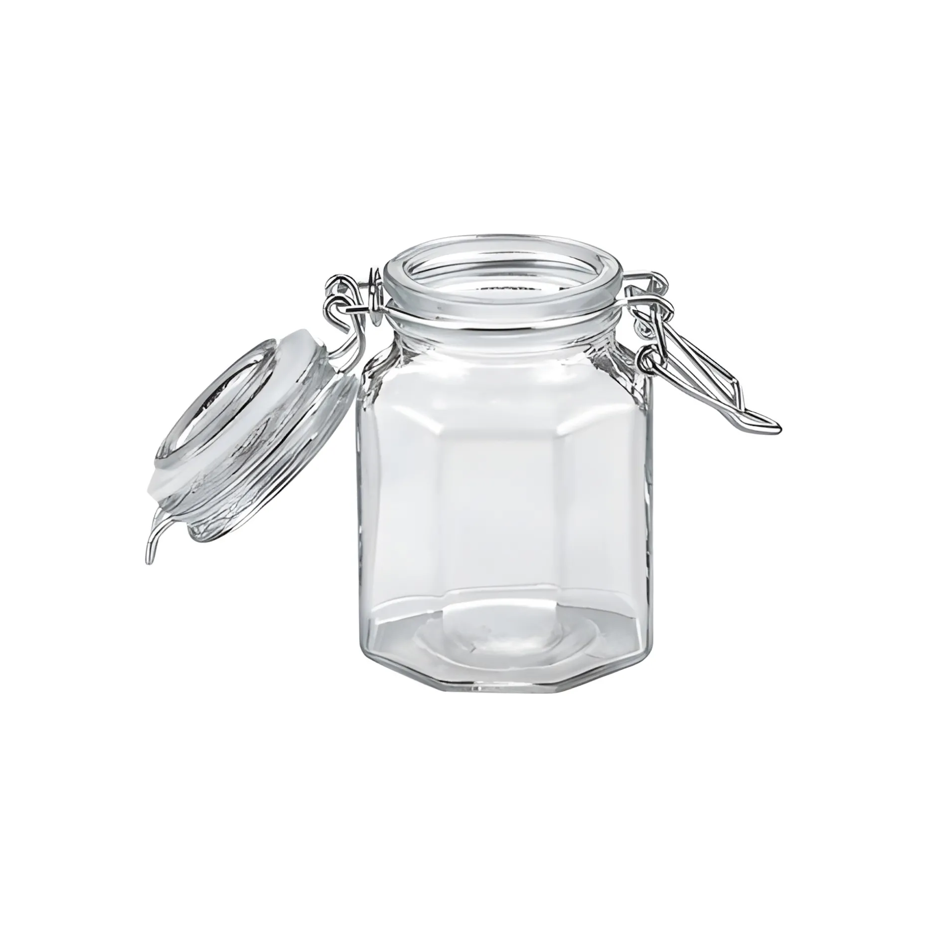 Kleines Achtkant-Bügelglas mit Dichtungsring. Das Mini-Vorratsglas ist super geeignet für Bonbons, Kräuter und andere trockene Zutaten, die dank des Gummirings luftdicht verschlossen werden. Vor allem im Gewürzregal kommt das kleine Achtkantglas super zur Geltung und wird zugleich platzsparend verstaut.