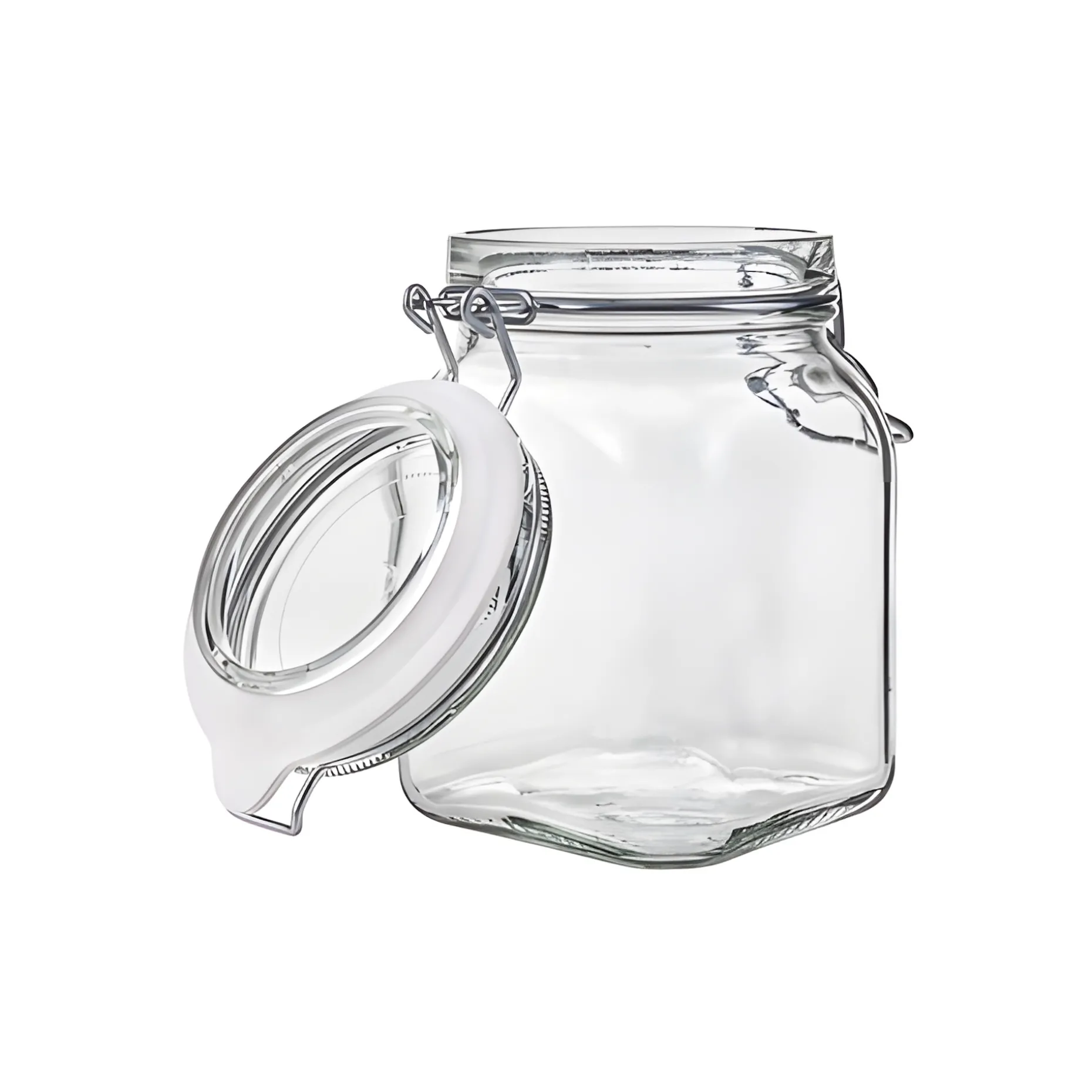 Schönes Drahtbügelglas mit weißem Gummiring zum Einlegen, Einkochen und Aufbewahren trockener Zutaten. Das Bügelglas ist mit seinen 750 ml ideal für selbstgemachte Soßen, leckeres Kompott und eingelegtes Gemüse, das sicher verschlossen wird und damit lange haltbar ist. Das Einmachglas mit der breiten Öffnung lässt sich super befüllen und kann auch gut für getrocknete Früchte, Paniermehl und Nüsse verwendet werden.