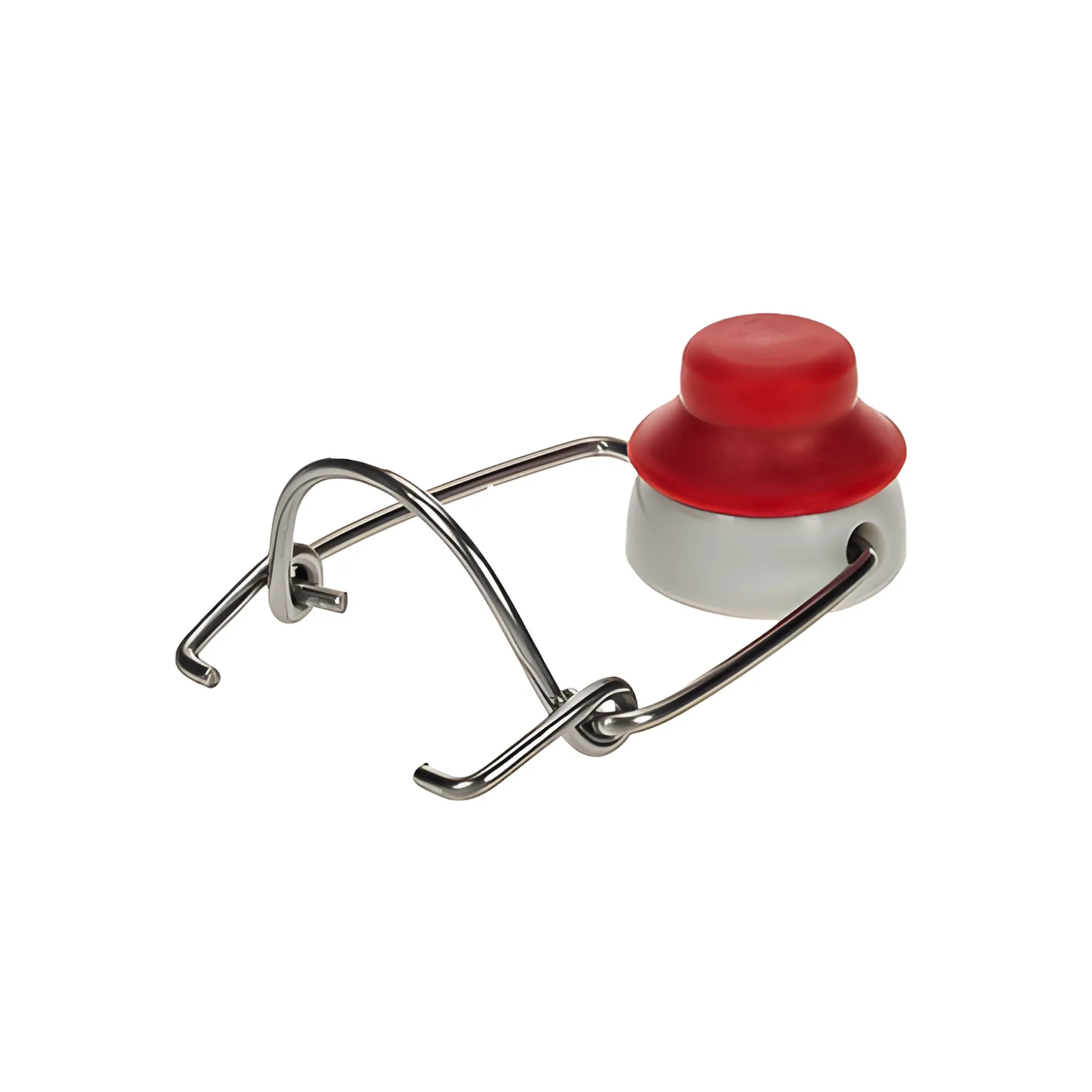 Der Bügelverschluss XL mit weißem Kunststoffkopf und roter Dichtung ist speziell für große Flaschen geeignet wie die Bügelflasche 2000 ml braun. Am Flaschenhals befinden sich zwei Mulden, in welche die Metallbügel festgesteckt werden.