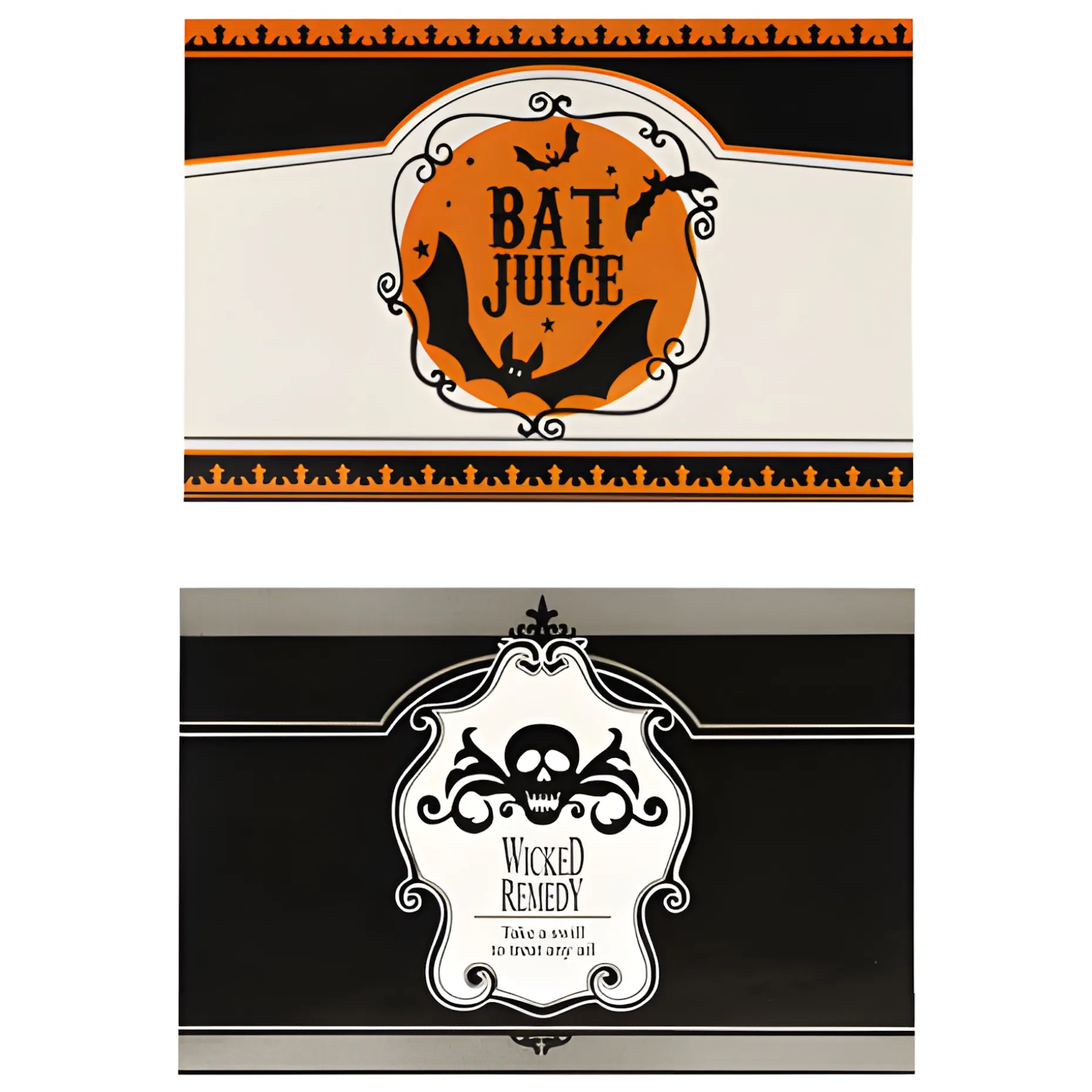 Perfekte Aufkleber für Halloween zum Dekorieren von großen Gläsern und Flaschen. Die selbstklebenden Papiersticker lassen sich einfach von der Folie ablösen und am Glas anbringen. So können Sie selbstgemachten Saft, Sirup oder Süßigkeiten ganz im Halloween-Stil präsentieren und die ‚gruseligen‘ Leckereien entweder verschenken oder als Dekoration verwenden. In dem Pack sind 6 große Flaschenaufkleber enthalten, die mit den Schriftzügen ‚Bat Juice‘ und ‚Wicked Remedy Take a swill to treat any ail‘ versehen sind.
