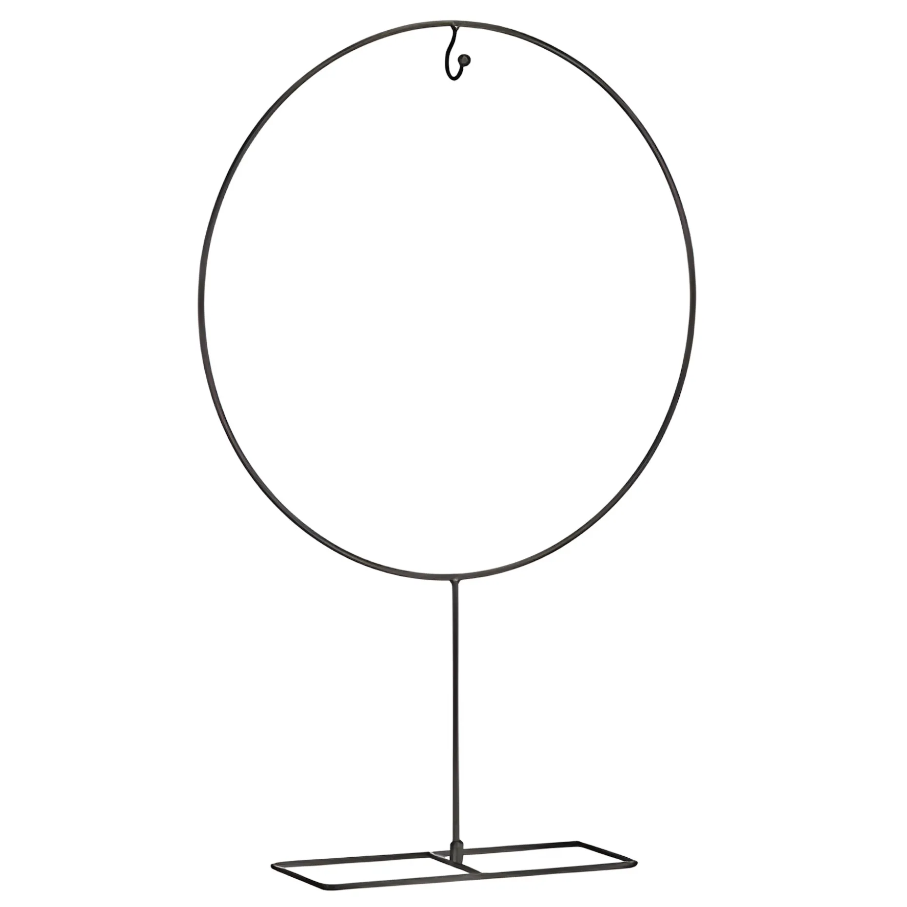 Dieses schwarz lackierte Eisengestell, mit einem Haken am oberen Ende des Ringes, ist ein sehr vielseitiges Dekoelement, dass überall und zu jeder Jahreszeit genutzt werden kann. Der Metallring wird auf den rechteckigen Standfuß (22 x 11 cm) geschraubt und kann auf das Fensterbrett oder Sideboard gestellt werden. Kleine Blumenarrangements oder Deko-Tierchen werden am Haken hübsch präsentiert und auch als Weihnachtsdeko mit Lichterketten umwickelt und Stern-Anhänger am Haken wird eine besonders schöne Raumdekoration gezaubert. Denkbar ist auch die Variante eines hängenden Windlichts.