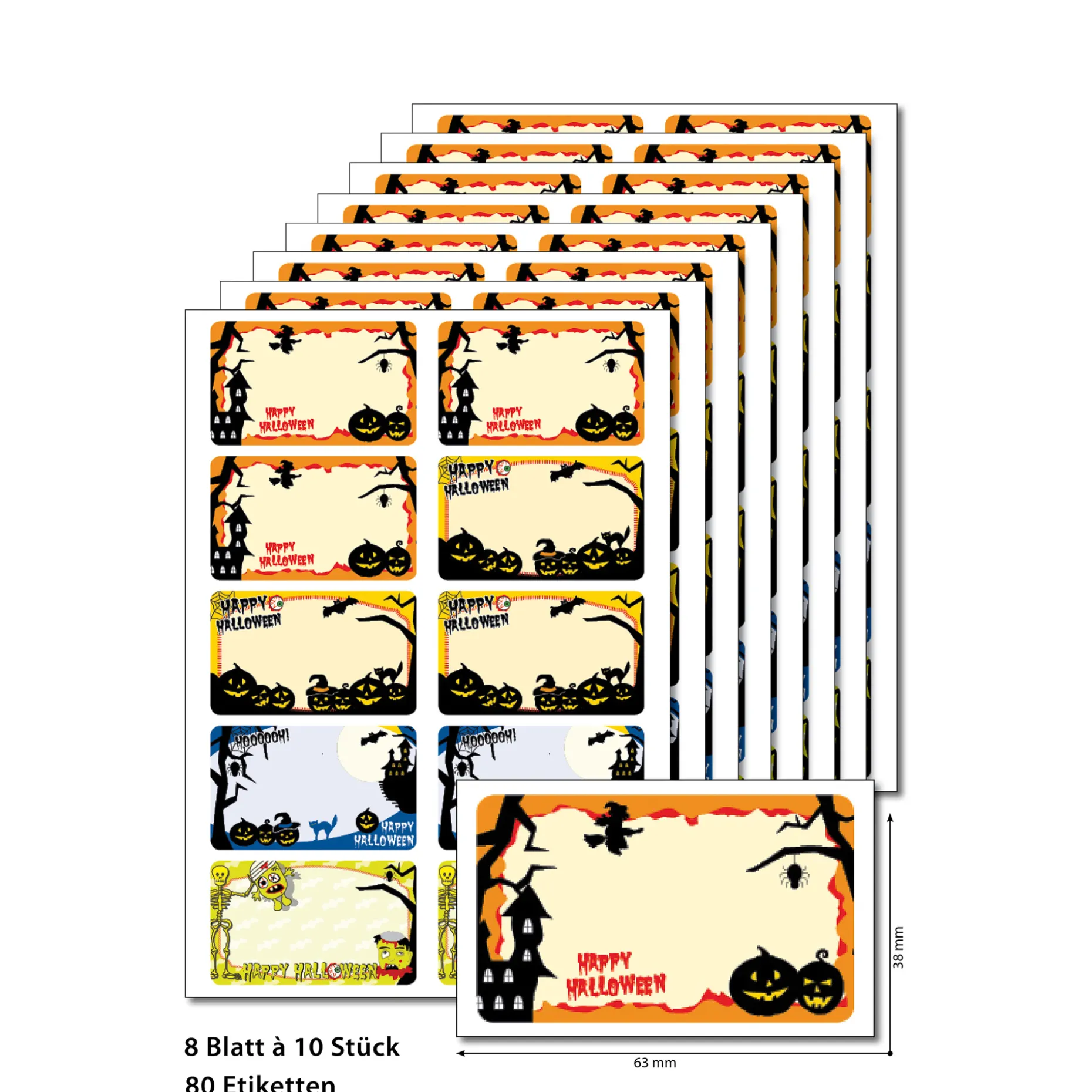 Das Einzeletikett hat das Maß von ca. 63 x 38 mm und es sind je 10 Etiketten auf 8 Bögen = 80 Etiketten.
