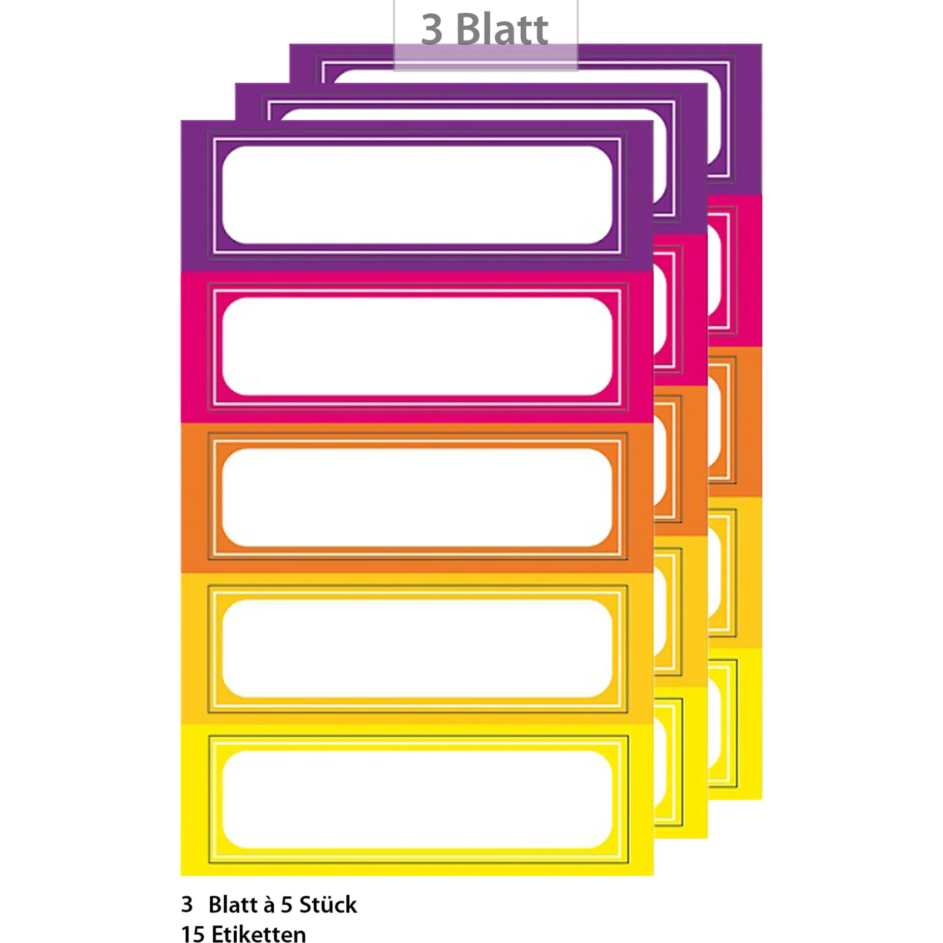 Rechteckige Etiketten mit gelben, orangen, pinken und lila Rahmen.
